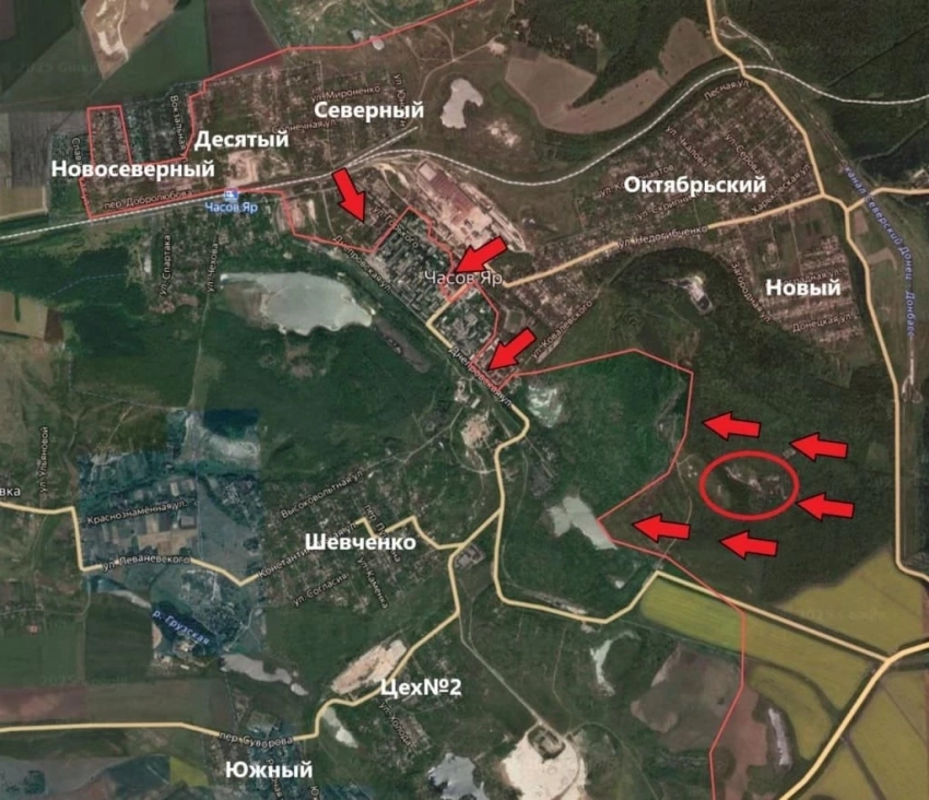 В Часов Яре наши подразделения заняли позицию на вершине отвала на западной окраине рудника «Блок-9». Большая часть микрорайона Северный в Часовом Яре находится под контролем российских военных, сообщил командир группы штурмовиков бригады "Эспаньола. Южнее действуют подразделения ВДВ, севернее - 200-я бригада мотострелков ВС России.