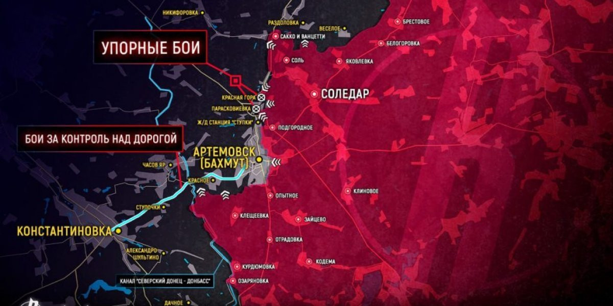 Одновременно с этим продолжаются бои к юго-западу за дорогу, которая ведет на Константиновку. По некоторым данным, ЧВК «Вагнер» пытаются перерезать этот путь, который пролегает между Ступочками и Красным (Ивановским). Параллельно с Артемовском также продолжается продвижение и к Северску, где идет наступление на Веселое и Раздоловку.