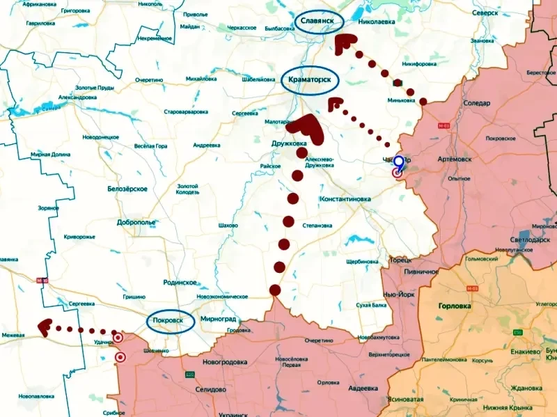 Согласно первому варианту развития событий, после взятия ВС РФ Покровска (освобождения российского Красноармейска), наши войска двинутся на запад — в малонаселенные равнины Днепропетровской области, «которые слабо укреплены и не представляют Киеву никаких естественных или городских препятствий для обороны».