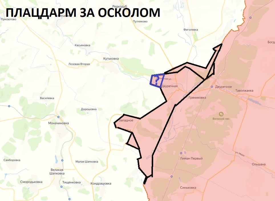 Накануне пошли многочисленные привязки с нашего плацдарма за Осколом. На текущий момент, практически все данные о нашем продвижении подтверждены, даже соединение плацдармов у Двуречной и Новомлынска доказано. Единственное «но», пока мы не получили привязку из западной части Двуречной, а так контуры контроля ясны. По-прежнему загадкой остается количество сил и средств на плацдарме, для этого необходимо увидеть кадры наших атак. Одно можно сказать наверняка - ВСУ запустили ситуацию за Осколом, и теперь простого выхода для них не осталось.