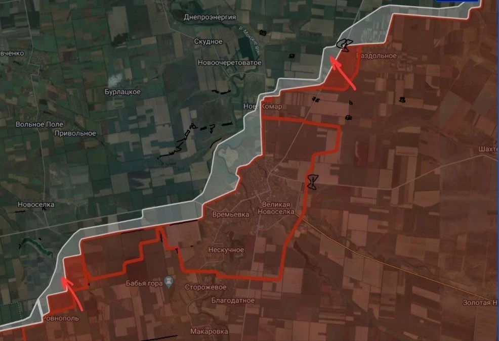 На Великоновосёлковском направлении ВС РФ расширили контроль территории и продвинулись в районе Раздольного на участке шириной до 2.6 км на глубину до 950 м. и в районе Ровнополя на участке шириной до 3.23 км на глубину до 900 м.