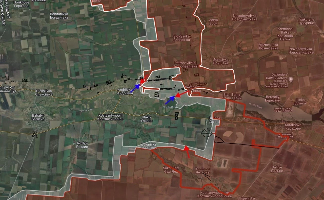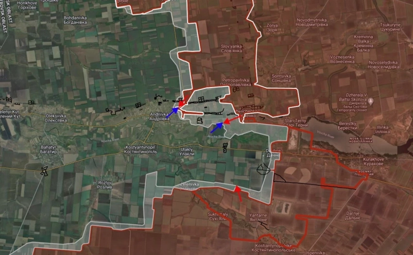 На Константинопольском направлении продолжаются встречные бои в восточной части Андреевки, ВС РФ давят с опорой на Шевченко. Кроме того, российские войска расширили контроль территории в районе Янтарного в направлении Улаклы.