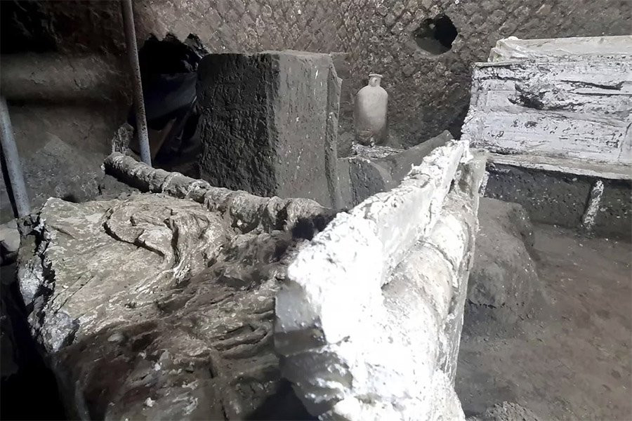 В то время как одна из двух кроватей, найденных за последние недели, такой же фактуры, предельно простой и без матраца, как и кровати 2021 года, другая — более удобного и дорогого типа, известная в библиографии как «кровать спальера». В цинерите до сих пор видны следы красных украшений на двух спинках. Помимо двух кроватей, в недавно раскопанной комнате находятся два небольших шкафа, также частично сохранившиеся в виде слепков, ряд амфор и керамических ваз, а также различные инструменты, в том числе железная мотыга.