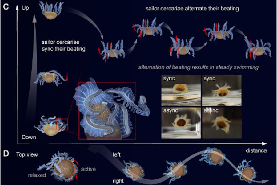 Исследователи обнаружили колонию церкарий, свободноживущих личинок Digenea, состоящую из двух различных морфотипов. Более крупные церкарии, названные "моряками", были ответственны за передвижение, в то время как меньшие церкарии, "пассажиры", предположительно помогали в заражении.
