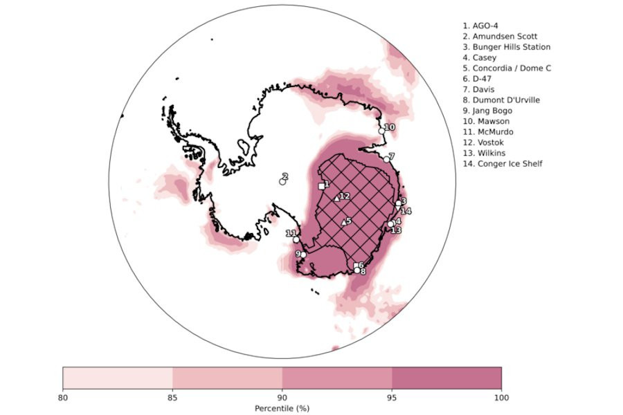 Экстремальная температура в Восточной Антарктиде (-9,4°C), зарегистрированная учёными British Antarctic Survey (BAS), установила новый рекорд, превысив среднюю температуру на 30–40°C.
