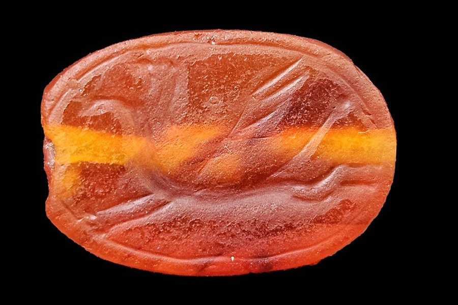 Находка представляет собой красновато-коричневый сердолик размером примерно с ноготь. На одной стороне камня изображен жук, а на другой замысловато выгравирована фигура грифона или крылатой лошади. Этот стиль искусства типичен для ассирийской и вавилонской цивилизаций, процветавших в это время.