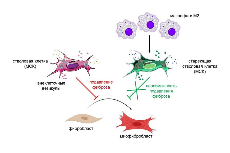 Ученые из Московского государственного университета имени М. В. Ломоносова (Москва) исследовали роль макрофагов М2 в развитии фиброза. За правильное восстановление тканей (без фиброза) отвечают стволовые клетки. Они подавляют превращение нормальных клеток ткани в миофибробласты — тип клеток, отвечающих за возникновение и прогрессирование фиброза. Это значит, что при нормальной работе стволовых клеток заболевание не возникает. Чтобы проверить, как на стволовые клетки влияют макрофаги М2, авторы выдерживали стволовые клетки вместе с белками, полученными от макрофагов, на чашках Петри в течение 48 часов. Эксперимент показал, что добавление таких соединений приводит к старению стволовых клеток, в результате чего они теряют способность подавлять образование миофибробластов и больше не могут обеспечивать восстановление нормальных тканей.