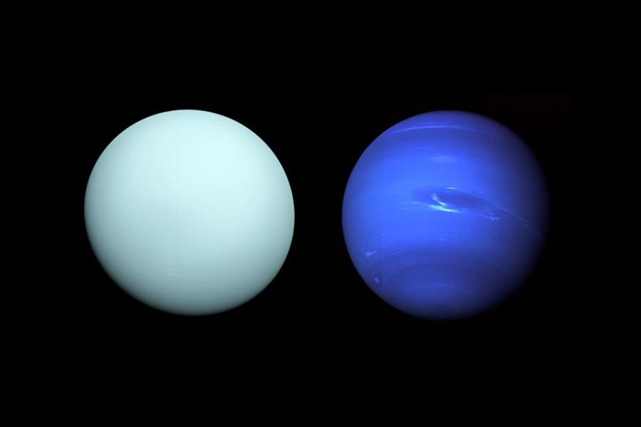 Уран и Нептун — две самые отдаленные планеты нашей Солнечной системы. Они отличаются от Юпитера и Сатурна и имеют ряд общих характеристик, основанных на их составе. Атмосфера, богатая аммиачным и метановым льдом, а также объемы воды отличают их от других газовых гигантов. Оба имеют характерный синий оттенок из-за своего состава, но Уран уникален своим экстремальным наклоном оси в 98 градусов. Если наблюдать издалека, кажется, что он вращается вокруг Солнца на боку. На Нептуне скорость ветра превышает почти 2000 километров.
