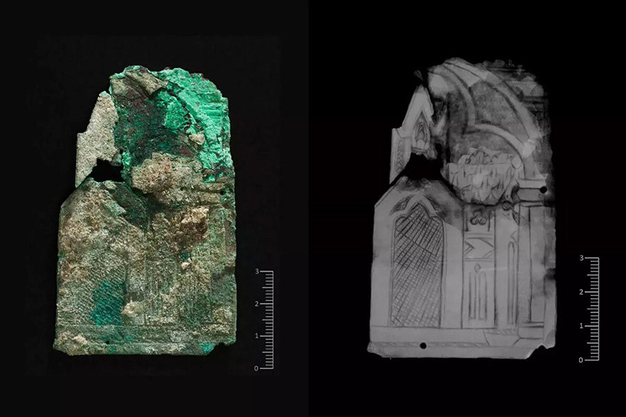 «Мы были очень удивлены, когда провели рентгеновское исследование медной пластины. На изображении ясно видно церковное здание с башней и крышей, колоннами и окнами», — говорит реставратор Беттина Эберт.