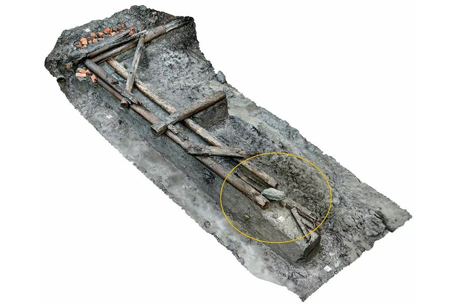 В ходе раскопок 2022–2023 годов археологи NIKU обнаружили хорошо сохранившийся кусок искусно обработанной древесины в толстой глине морского дна. Он был найден под столь же хорошо сохранившимися остатками деревянной пристани, которая была датирована примерно 1300 годом. Поэтому археологи предположили, что часть корабля датируется примерно тем же временем, но форма секции заставила их задуматься. Она сильно отличалась от других остатков кораблекрушения, которые они обнаружили в этом районе. Она изогнута с одной стороны и имеет отверстие в центре, через которое крепилась мачта для паруса корабля.
