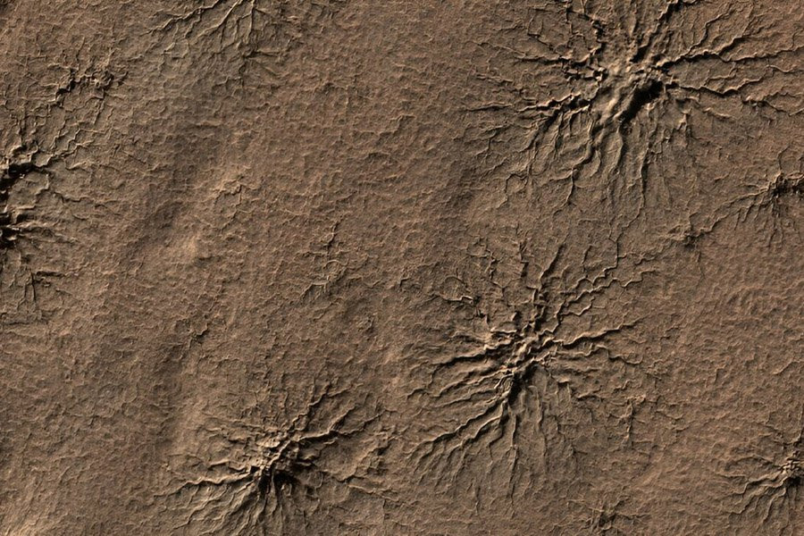 С момента их обнаружения в 2003 году с помощью изображений с орбитальных аппаратов ученые восхищались паукообразными формами, раскинувшимися по всему южному полушарию Марса. Никто не знает наверняка, как создаются эти геологические особенности. Каждое разветвленное образование может простираться более чем на 1 км от одного конца до другого и включать сотни веретенообразных «ног». Эти особенности, называемые аранеиформной местностью, часто встречаются в скоплениях, придавая поверхности морщинистый вид.