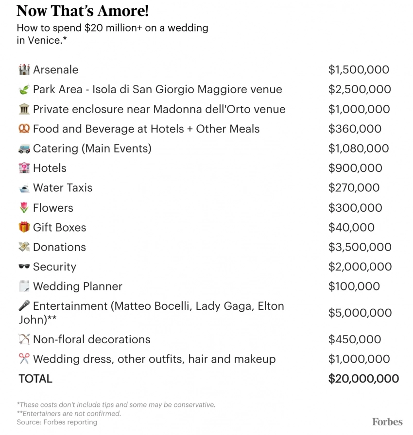 Список трат на свадьбе Джеффа Безоса и Лорен СанчесОтель Aman VeniceОтель Aman VeniceОтель Aman VeniceКейтеринг стоил чуть больше 1 млн долларов, а катание звёздных гостей на водных такси — 270 тысяч долларов. За цветы молодожёны заплатили почти как за еду — 300 тысяч долларов, а пожертвовали на благотворительность (вероятно, включая чаевые сотрудникам) 3,5 млн долларов.