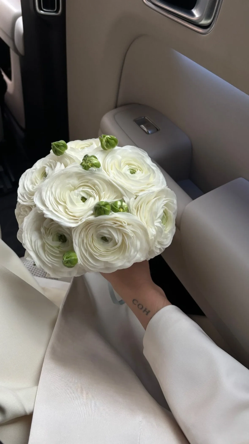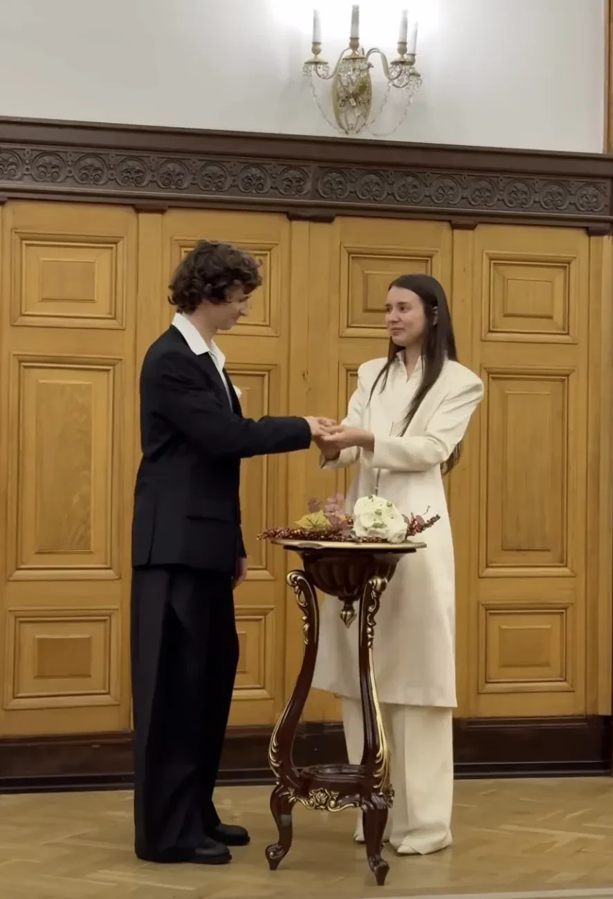Пара поженилась в Дворце бракосочетания № 1 Москвы в присутствии друзей и близких. Невеста была одета в удлинённый жакет и брюки, а жених — в чёрный костюм. После церемонии молодожёны с гостями отметили свадьбу в ресторане.