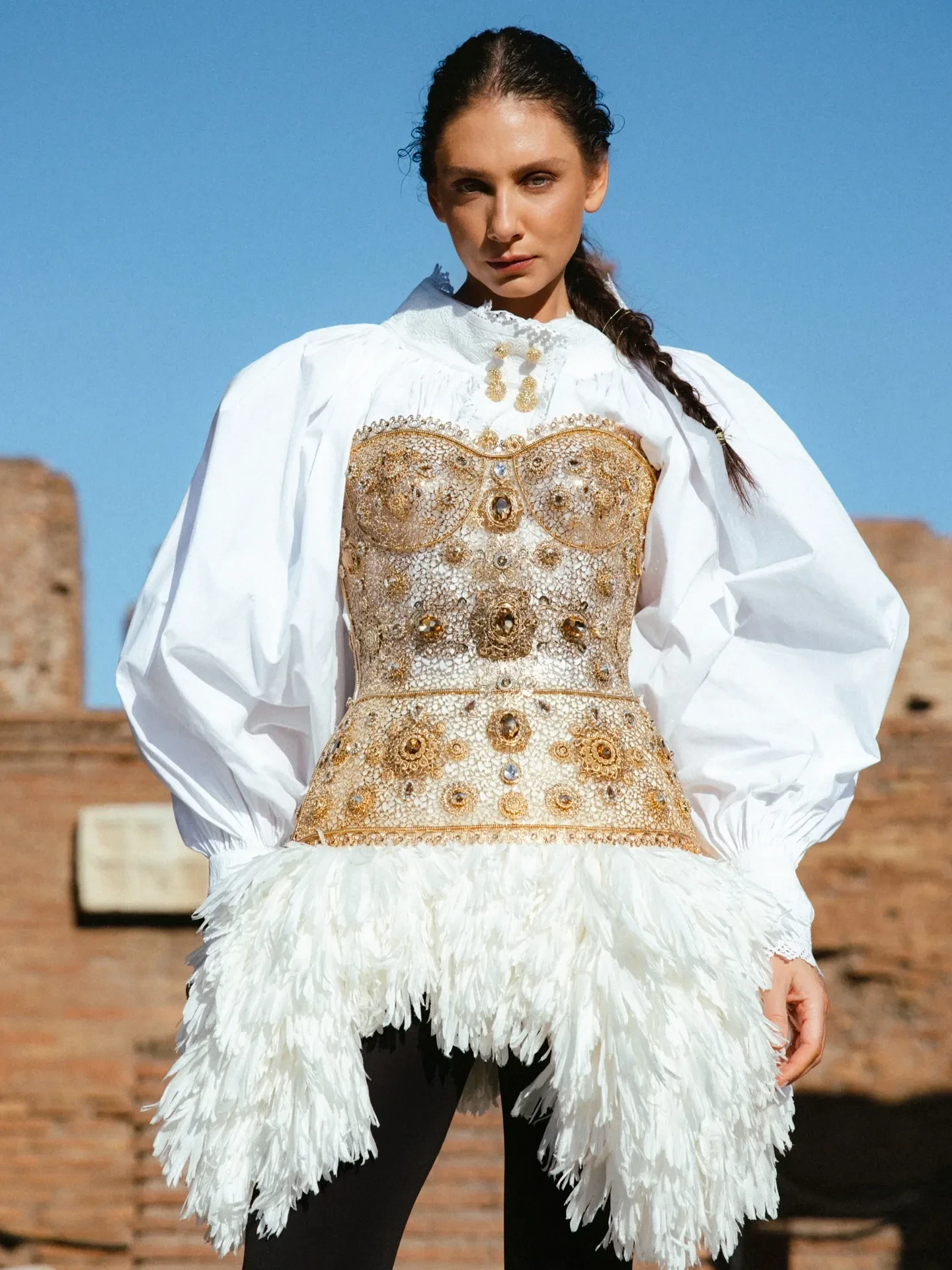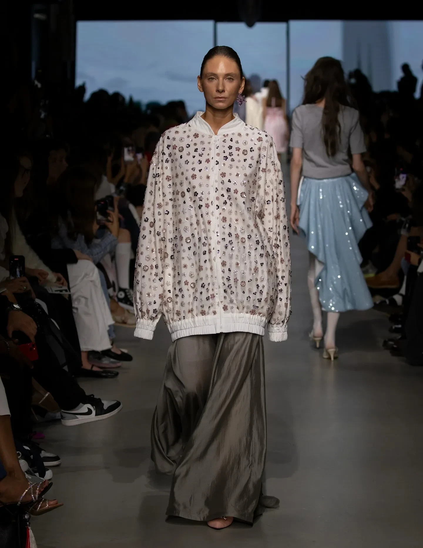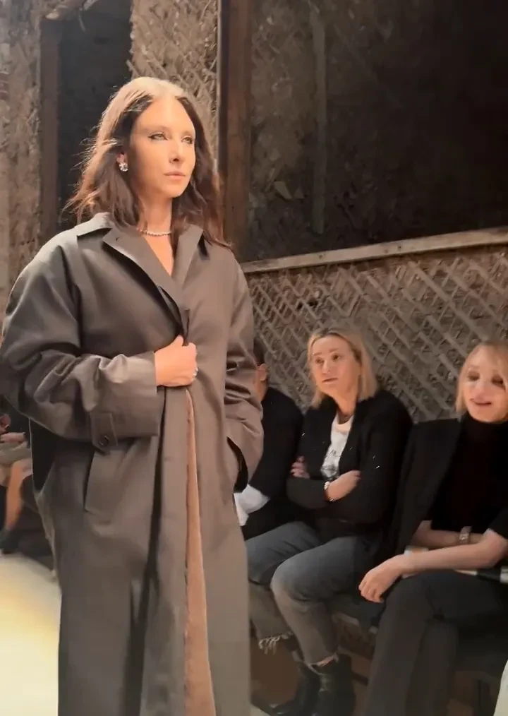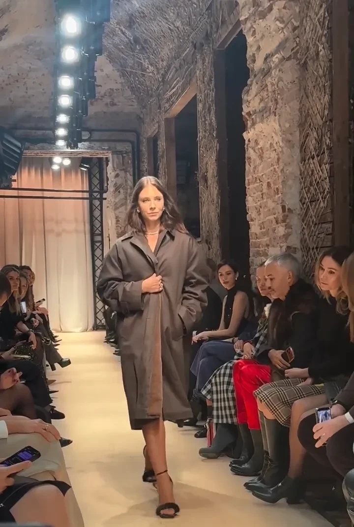 33-летняя Попова прошлась по подиуму в плаще с подкладкой из кроличьего меха. Образ модели завершали бриллиантовые украшения и туфли на шпильке. Её супруг наблюдал за показом из зала.