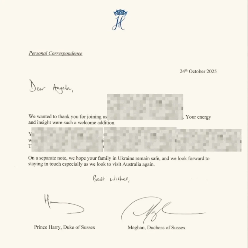 Принц Гарри, Анжела Перл, Меган МарклАнжела Перл и Принц ГарриФото Анжелы Перл"Мы хотели поблагодарить вас за участие в [мероприятии / встрече]. Ваша энергия и взгляд на вещи стали настоящим украшением вечера. [Пропущенные личные фразы]. Отдельно хотим отметить, что надеемся — ваша семья в Украине в безопасности. Будем рады поддерживать связь, особенно когда вновь соберёмся посетить Австралию", — говорится в письме.