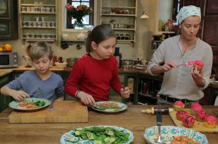 Юлия Высоцкая с сыном и дочерью на съёмках "Едим дома"