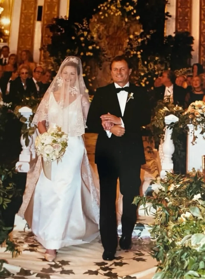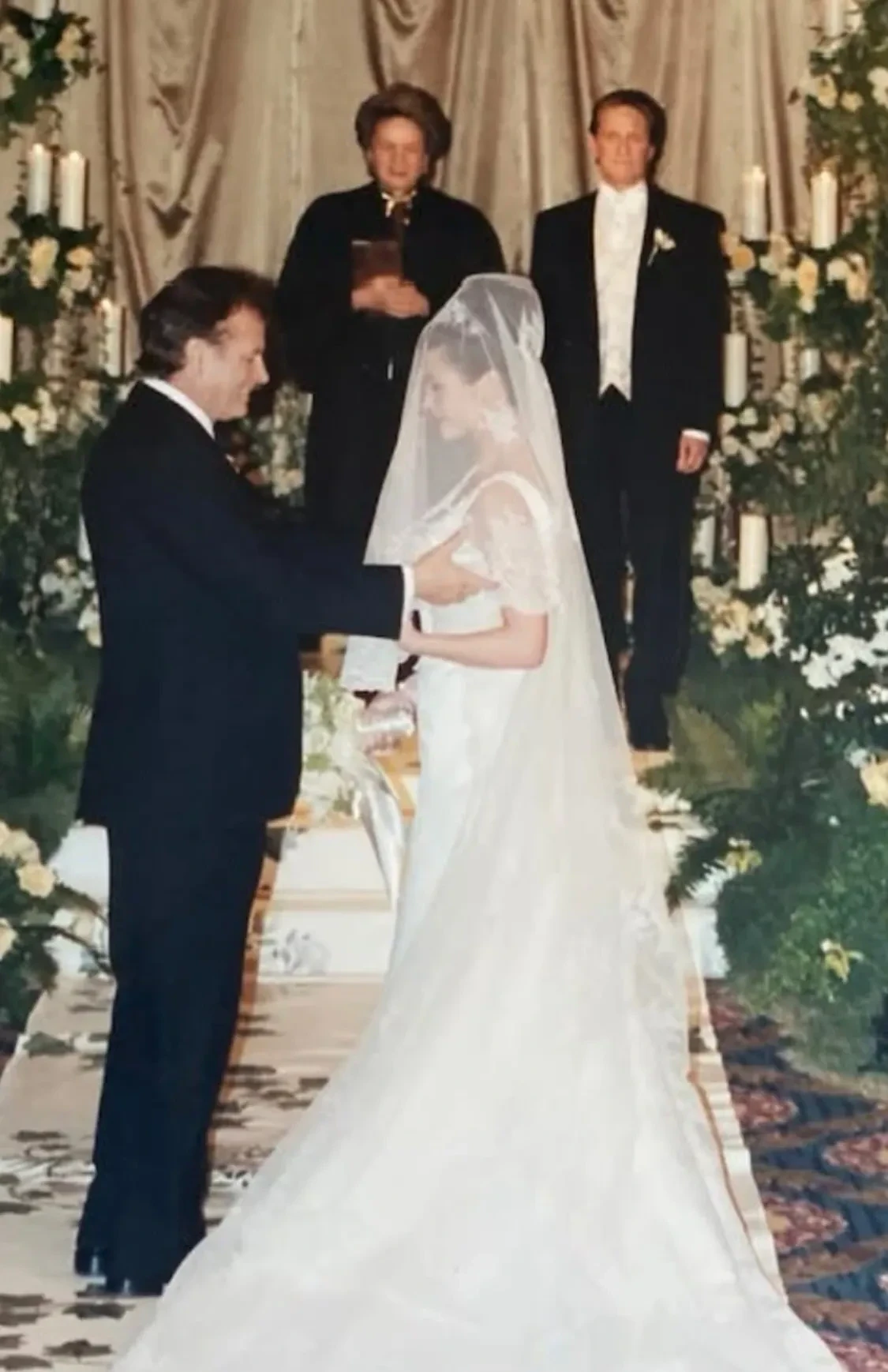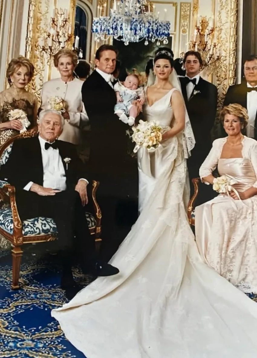 Кэтрин Зета-Джонс и Майкл Дуглас в день знакомстваДалее Зета-Джонс поделилась фотографиями со свадьбы, которая прошла в отеле Plaza в Нью-Йорке в 2000 году. На снимках актриса позирует с женихом, их трёхмесячным сыном Диланом и родителями.