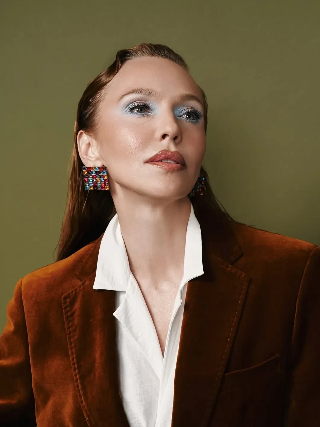 На снимках она предстала в чёрных микрошортах, белой блузке, коричневом пиджаке и коричневых сапогах, а также с ярким мейком авторства Станислава Кремлёва. В качестве фотографа выступила Дарья Морозова.