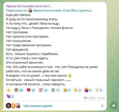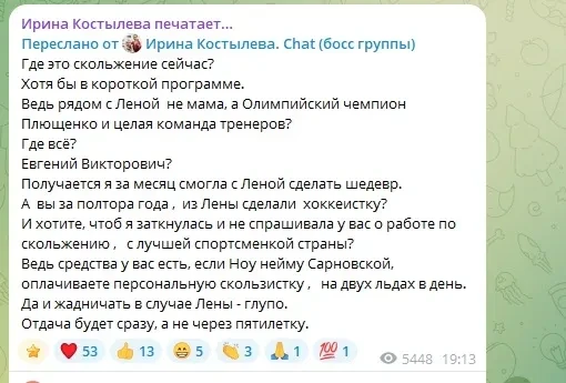 Елена Костылева и Евгений ПлющенкоРанее Ирина Костылева опубликовала в своём телеграм-канале серию постов, в которых заявила, что спустя полтора года после перехода в академию "Ангелы Плющенко" её дочь стала терять наработанные годами спортивные навыки. Поводом для её недовольства стал тот факт, что Елена заняла второе место на прошедшем этапе юниорского Гран-при России. Костылева-старшая также заявила, что Евгений настраивает дочь против неё, запретил ей появляться на тренировках фигуристки и ругать за нарушение диеты.