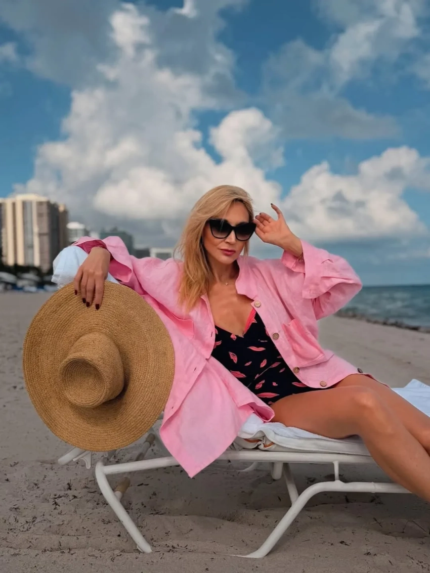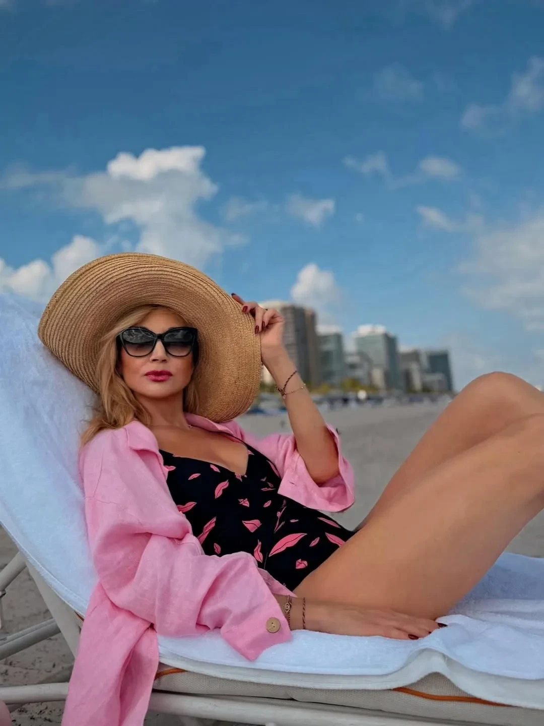На пляже Орбакайте позирует в слитном купальнике и розовой рубашке, а также в солнцезащитных очках и соломенной шляпе. "Зима в Майами", — подписала снимки певица.