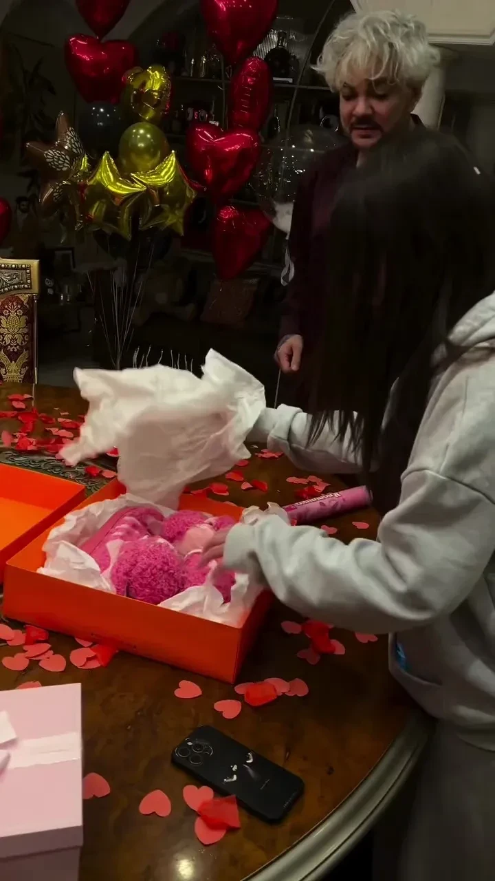 В видео, которое певец опубликовал в соцсетях, попали пакеты из ЦУМа с кроссовками из коллаборации дизайнера Джереми Скотта и adidas Originals ограниченного тиража (по цене около 150 тысяч рублей), коробка с ботинками-"луноходами" и подарок от брата девочки Мартина с консолью "тетрис" и косметикой (который, видимо, он приобрёл на карманные деньги).