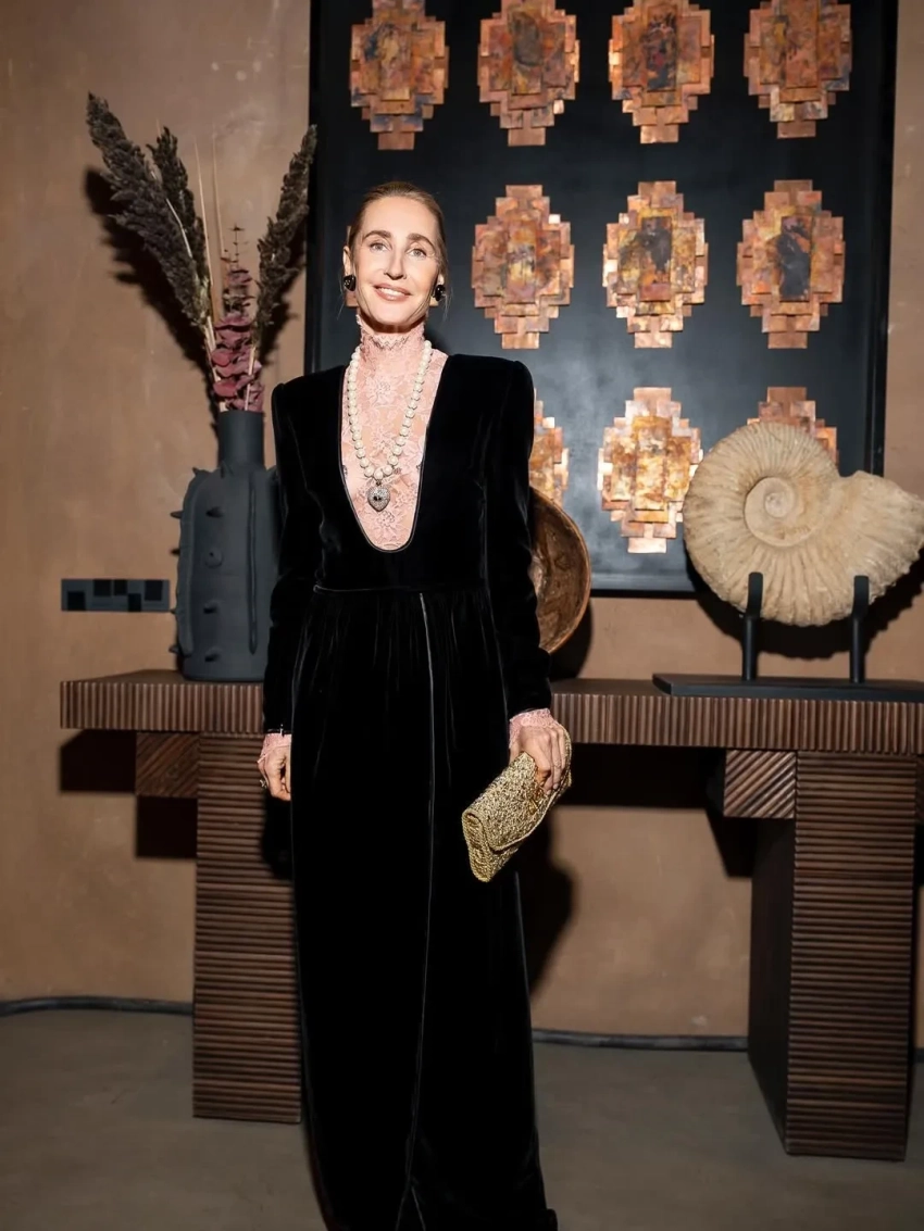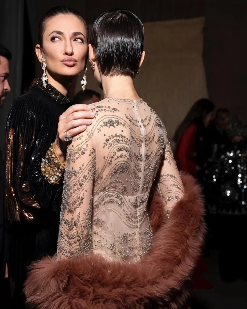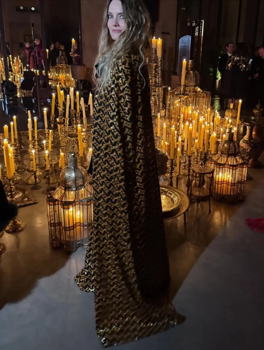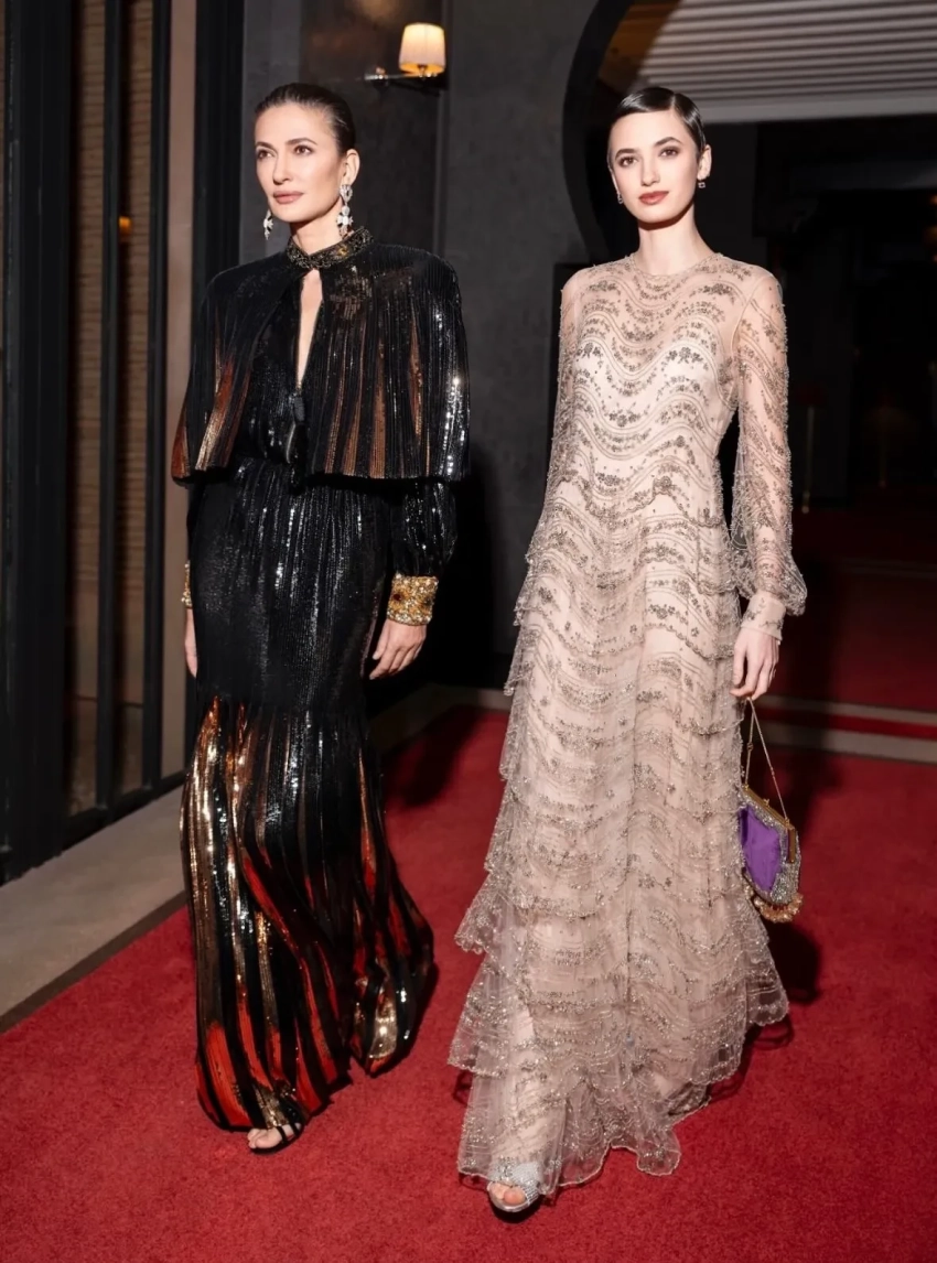 49-летняя Снежанна Георгиева пришла в чёрно-золотом платье и массивных серьгах, а её дочь Софья надела полупрозрачное платье бренда, дополнив образ сумкой с изображением собаки и меховой накидкой. 52-летняя Оксана Бондаренко позировала в чёрном бархатном платье с вставкой из розового кружева, а Екатерина Мухина примерила платье с декольте и вышивкой и длинную накидку.