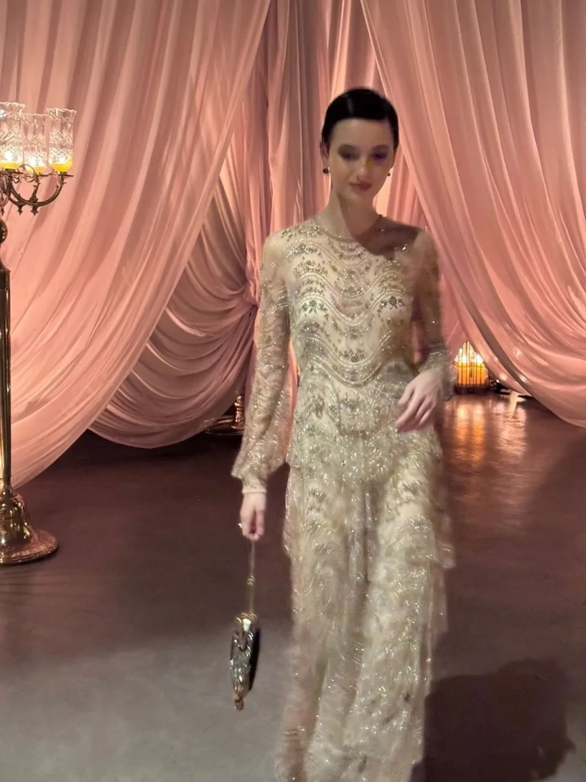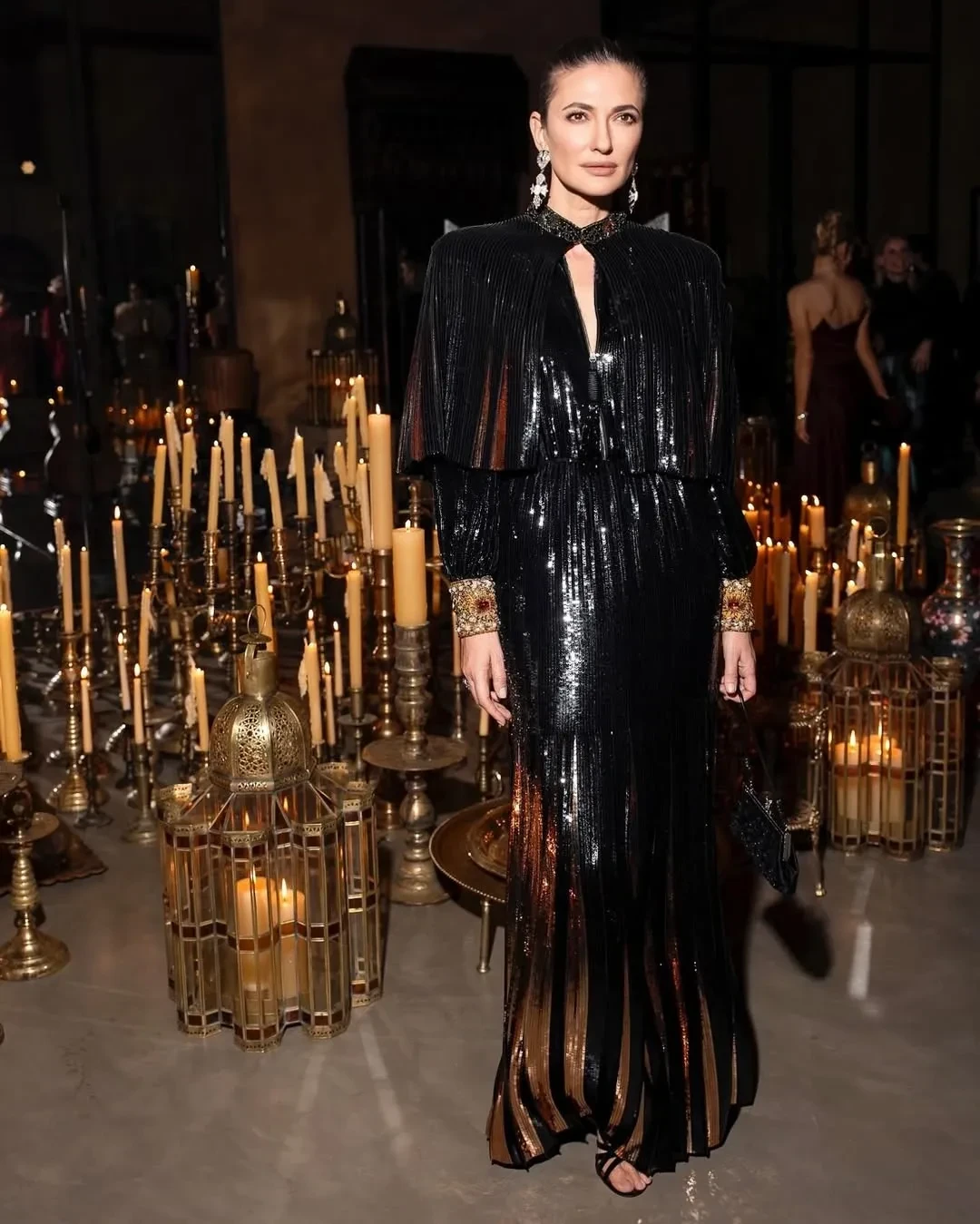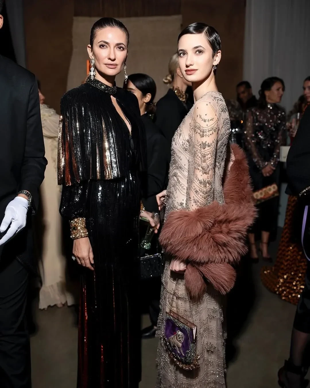49-летняя Снежанна Георгиева пришла в чёрно-золотом платье и массивных серьгах, а её дочь Софья надела полупрозрачное платье бренда, дополнив образ сумкой с изображением собаки и меховой накидкой. 52-летняя Оксана Бондаренко позировала в чёрном бархатном платье с вставкой из розового кружева, а Екатерина Мухина примерила платье с декольте и вышивкой и длинную накидку.