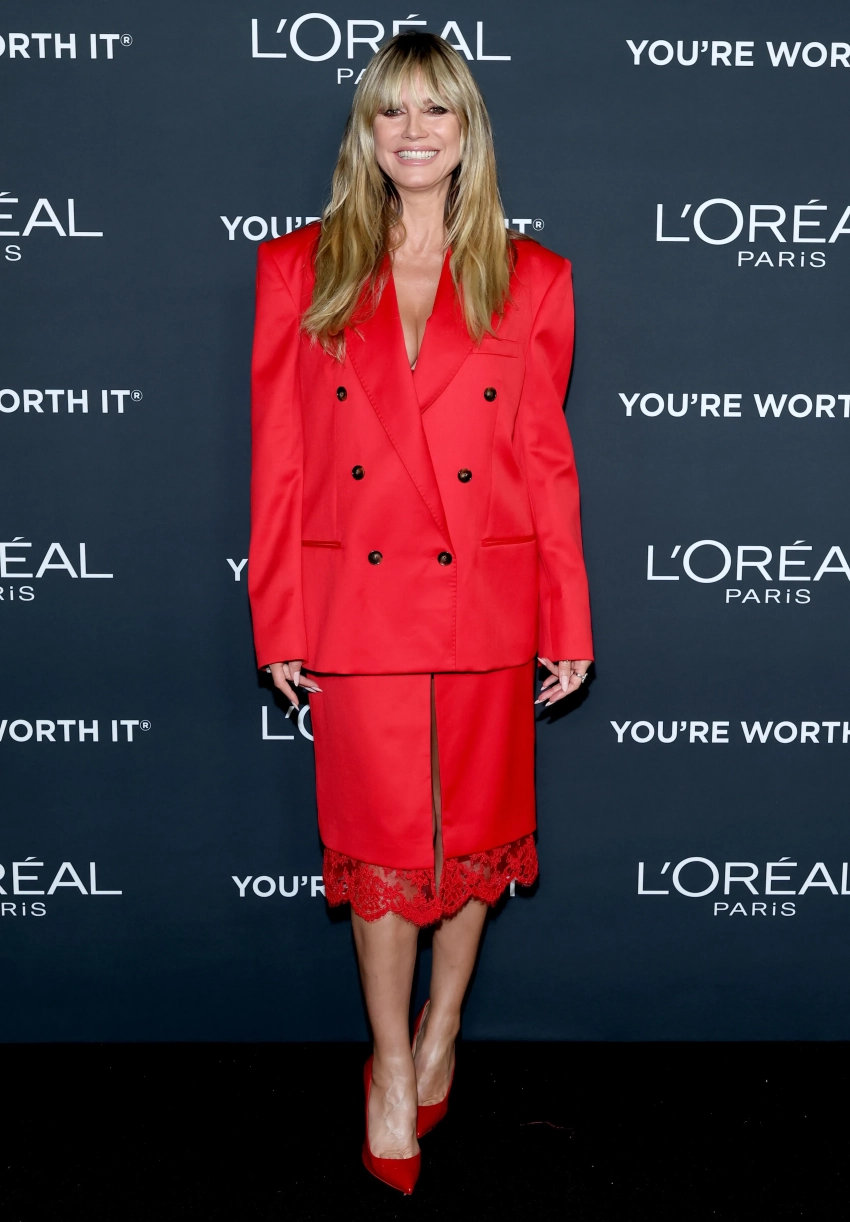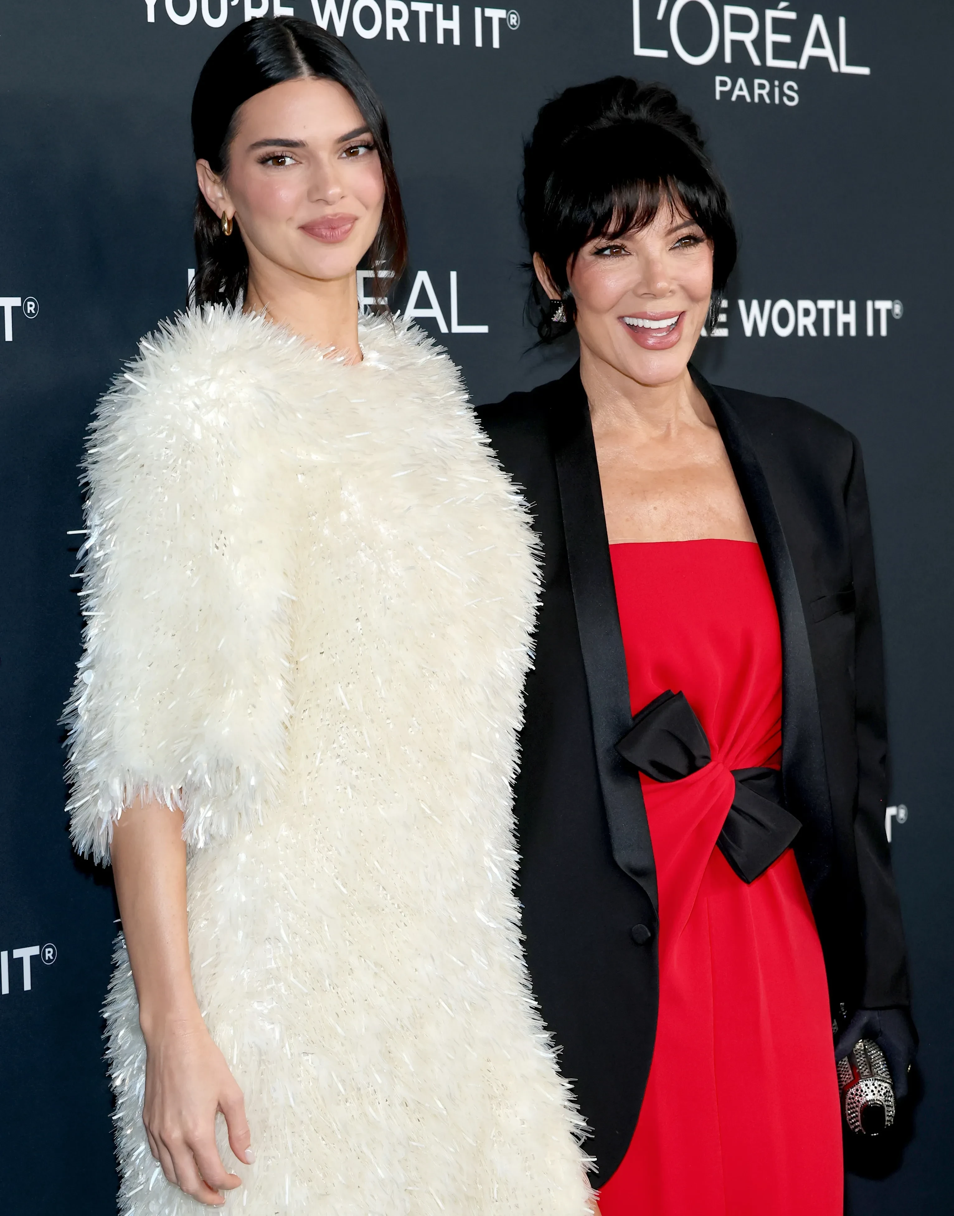30-летняя супермодель Кендалл Дженнер позировала на дорожке в пушистом белом платье Bottega Veneta с разрезом и туфлях в тон, а 70-летняя Крис Дженнер надела красное платье с бантом и чёрный жакет. 52-летняя Хайди Клум тоже выбрала красный наряд с юбкой с кружевом и пиджаком oversize.