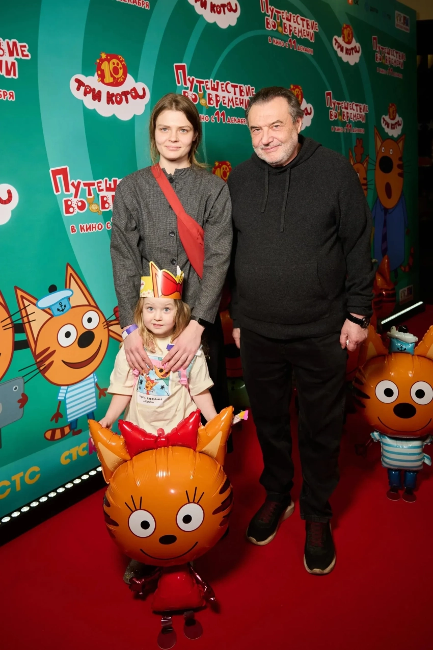74-летний Алексей Учитель вышел в свет со своей возлюбленной Софьей Мелединой и их четырёхлетней дочерью Ниной. Они посетили премьеру анимационного проекта "Три кота. Путешествие во времени".