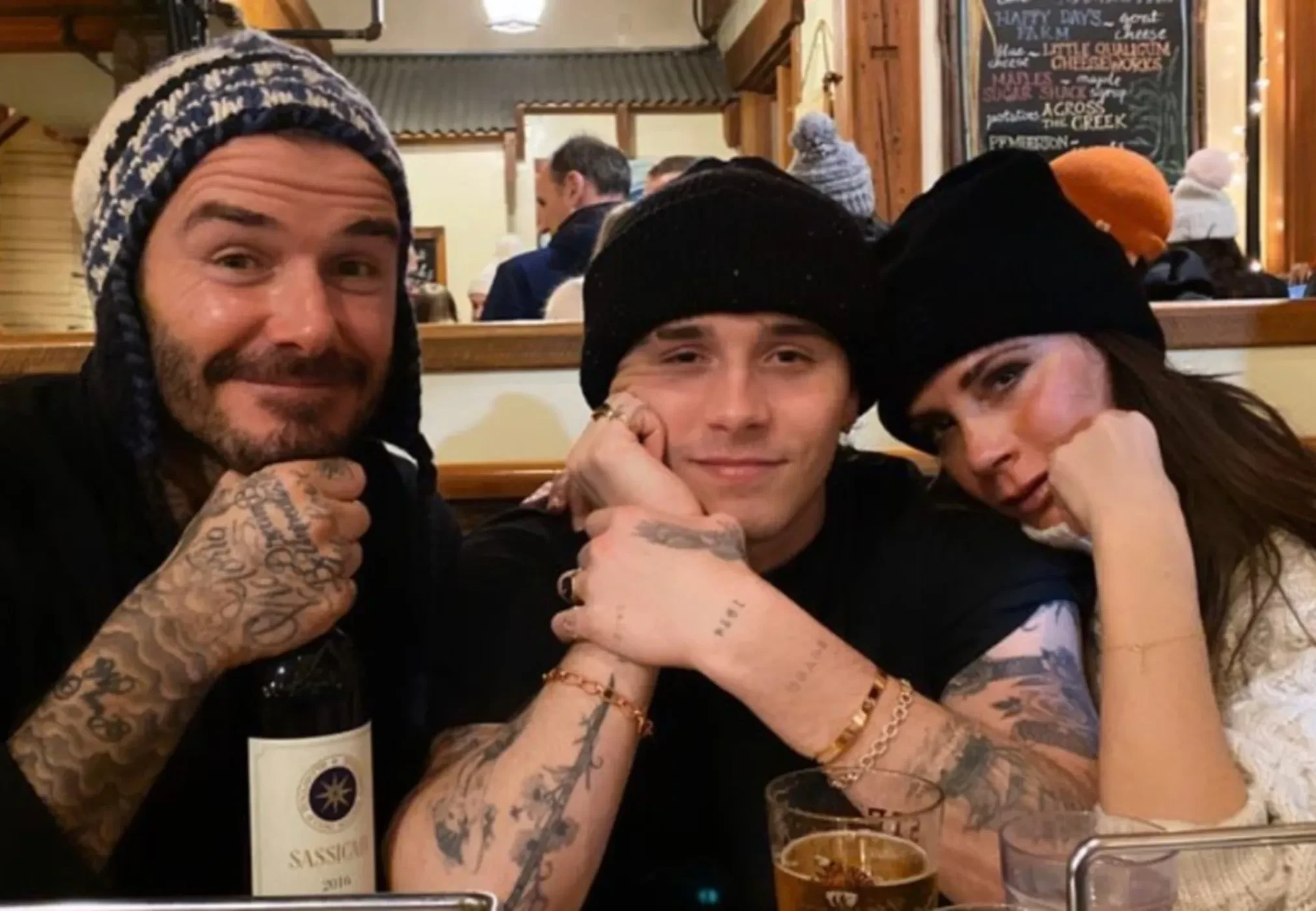 Дэвид, Бруклин и Виктория БекхэмОчевидно, Новый год и Рождество Бекхэмы встретили раздельно: Бруклин остался в США с женой и её родными, а Дэвид и Виктория отмечали праздник в Великобритании с младшими детьми.