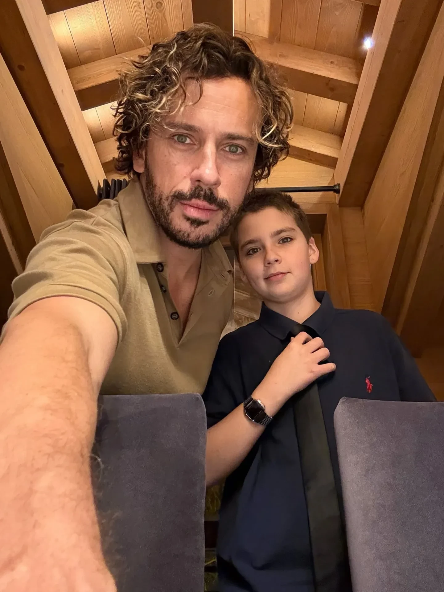 На снимке 12-летний Гарри, который ранее не так охотно снимался, позирует рядом с отцом в синей рубашке Ralph Lauren и чёрном галстуке. В подборку Галкин* также добавил кадр, где он отдельно запечатлён за большим праздничным столом, а также фото украшенных гирляндами елей. Вместо подписи пародист оставил эмодзи с солнечными очками.