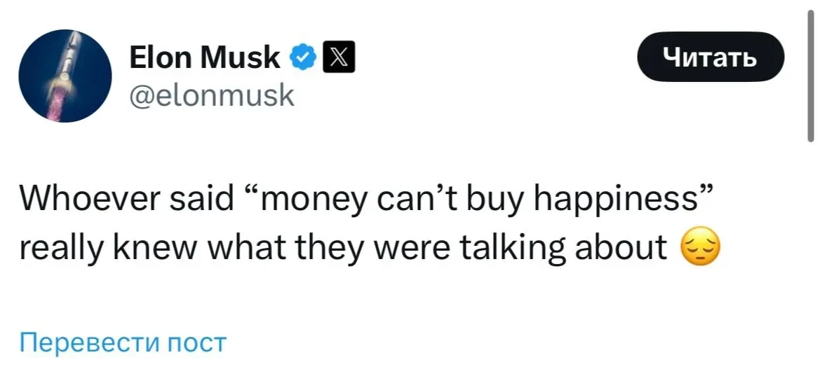 "Тот, кто сказал "за деньги счастья не купишь", на самом деле знал, о чём говорил", — написал 54-летний бизнесмен, сопроводив пост печальным смайлом.