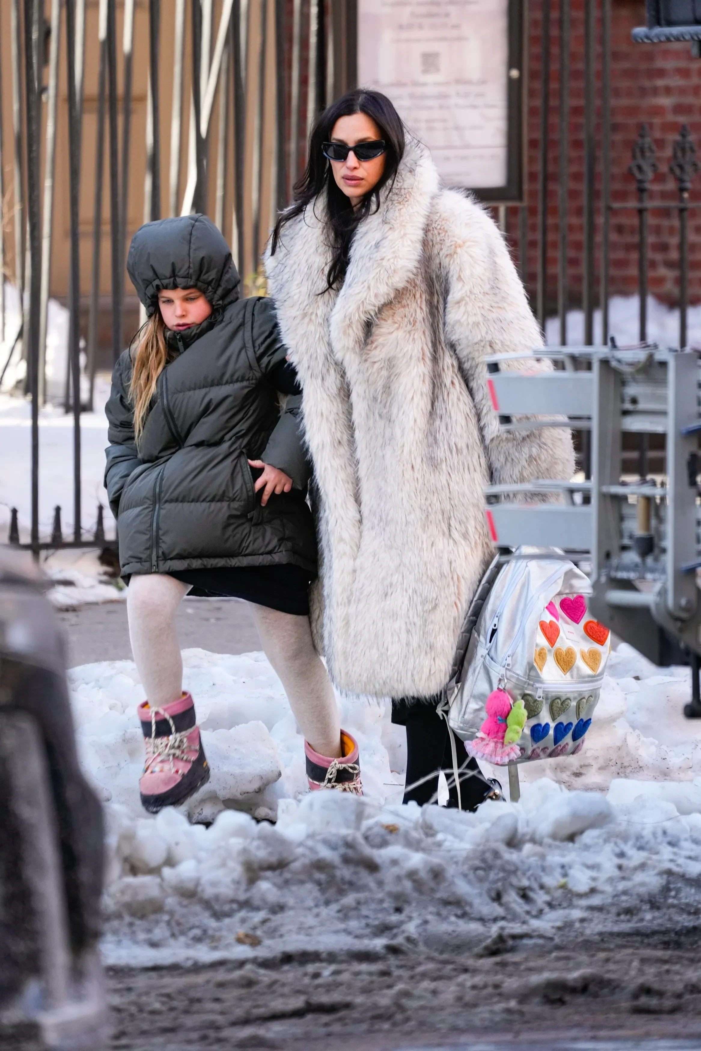 Маму и дочь засняли, когда те пробирались через сугробы к такси. На Ирине был уже знакомый её поклонникам образ: массивная светлая шуба, ботинки Junya Watanabe с шипами и солнцезащитные очки. При этом в руках она держала портфель дочери. Сама восьмилетняя Лея была в чёрном платье, поверх которого она надела серый пуховик, а также белые колготки и розовые ботинки-луноходы.