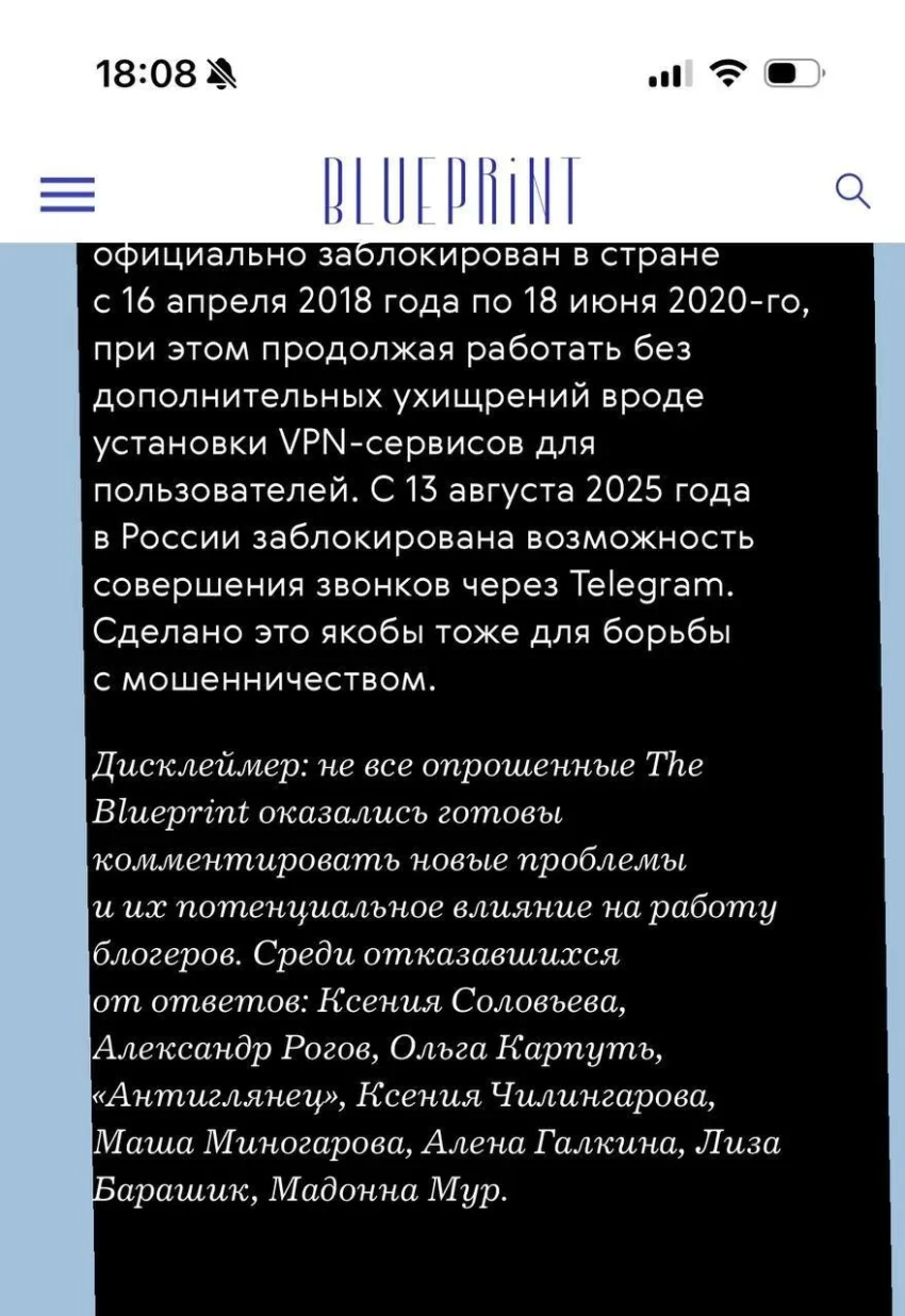 Фото "Антиглянца" (скриншот статьи The Blueprint)Мадонна Мур заявила, что впервые видит, чтобы отказавшиеся от комментариев для СМИ лица попадали в "позорный" дисклеймер. "Ну реально, ребята? Почему мы с другими админами обязаны комментировать замедление в Telegram? Мы должностные лица или представители площадки? Это всё ведет к тому, что спикеры будут бояться даже отвечать на запросы журналистов".