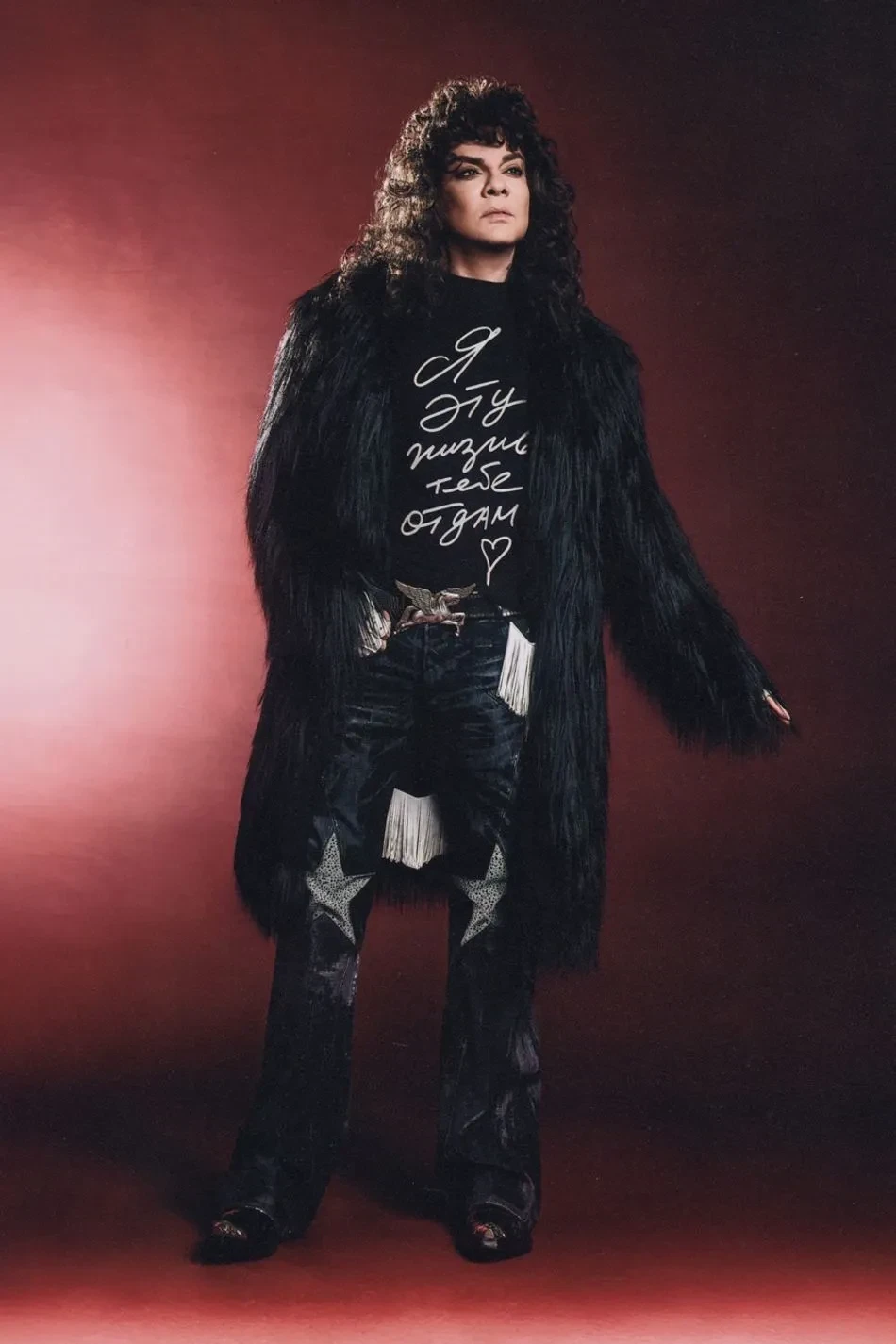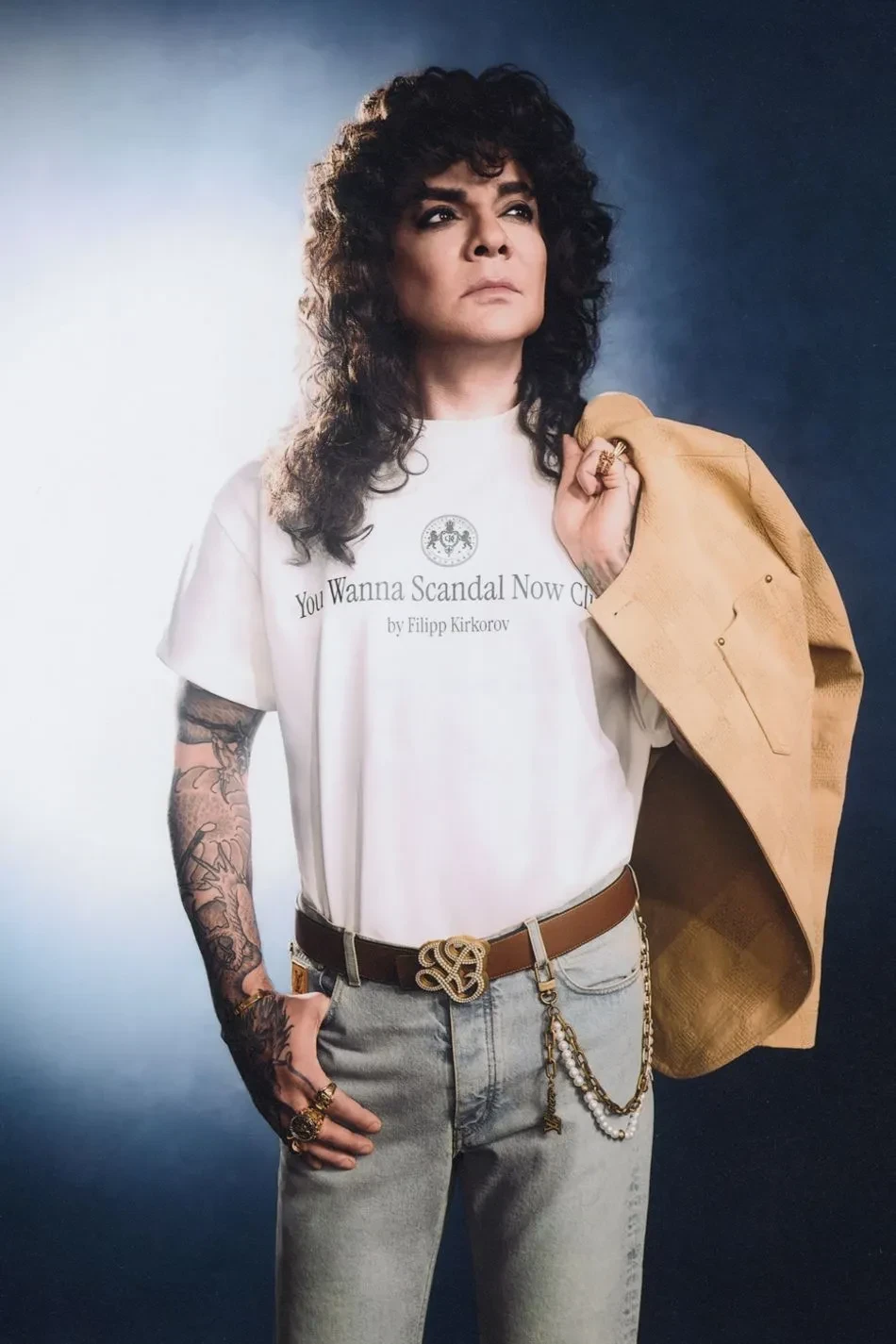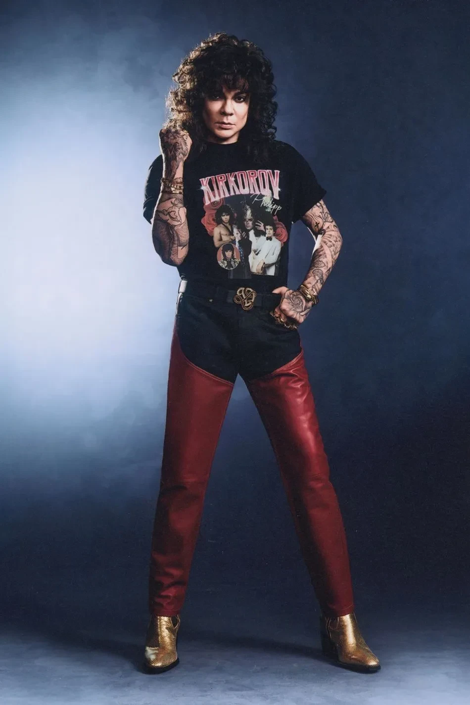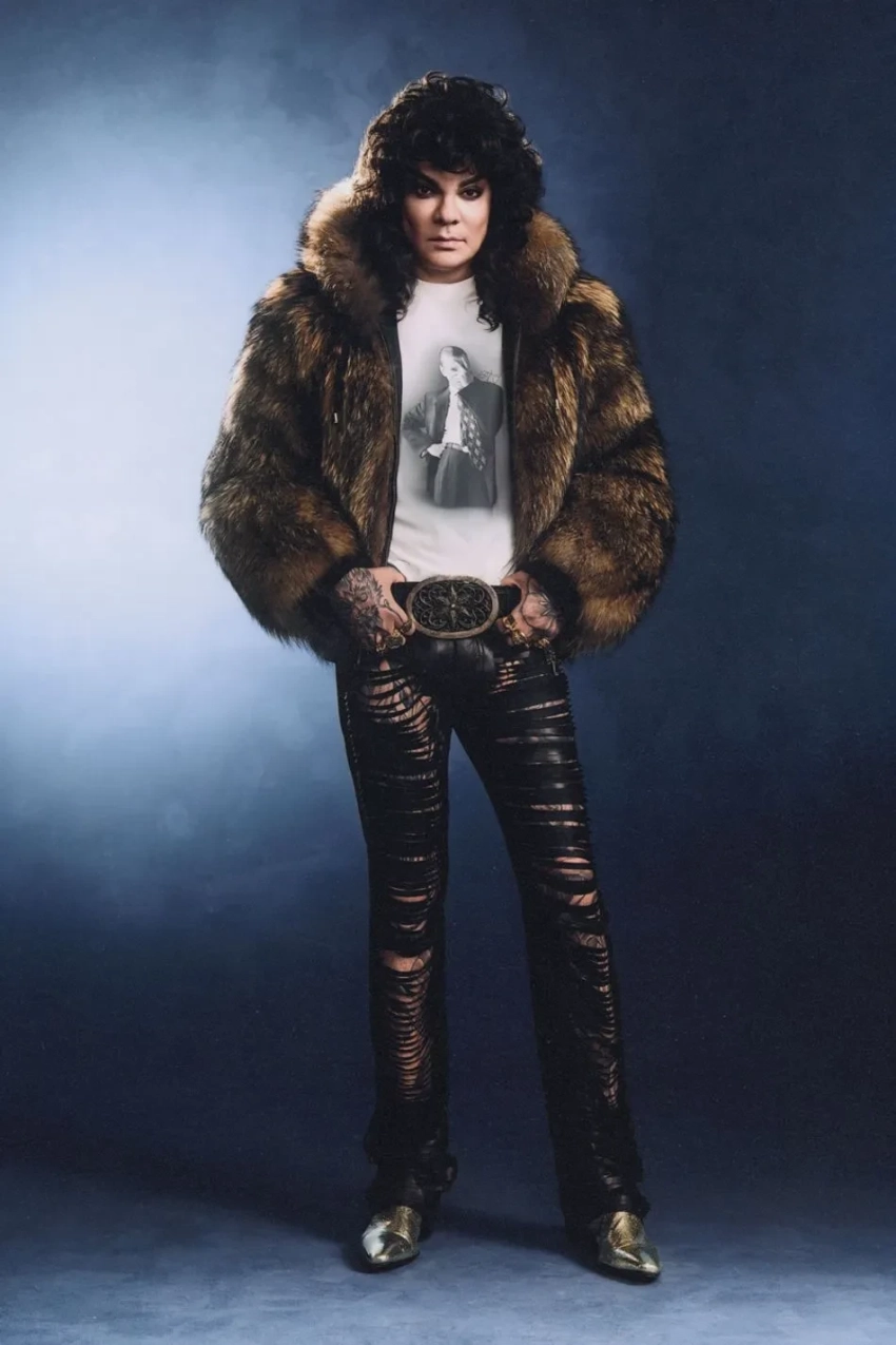 На снимках 58-летний народный артист России позирует в футболках из коллаборации, а также в разных шубах, кожаных брюках, джинсах клёш, ковбойских сапогах и куртке-косухе. Образы Киркорова дополнили массивные ювелирные украшения и причёска в стиле 1980-х годов.
