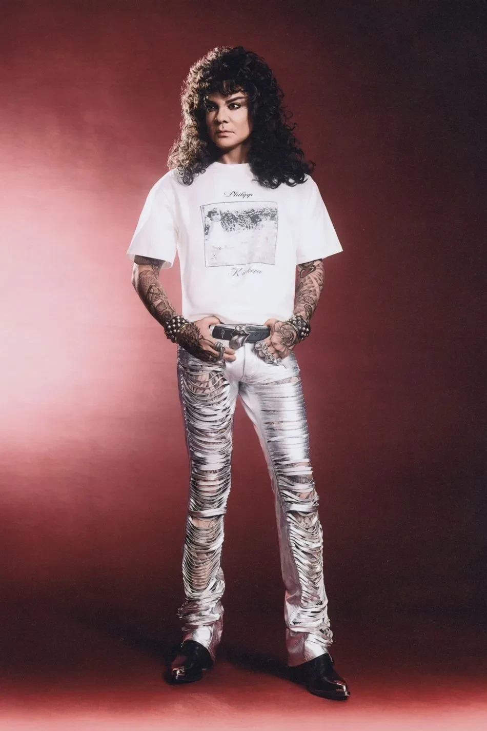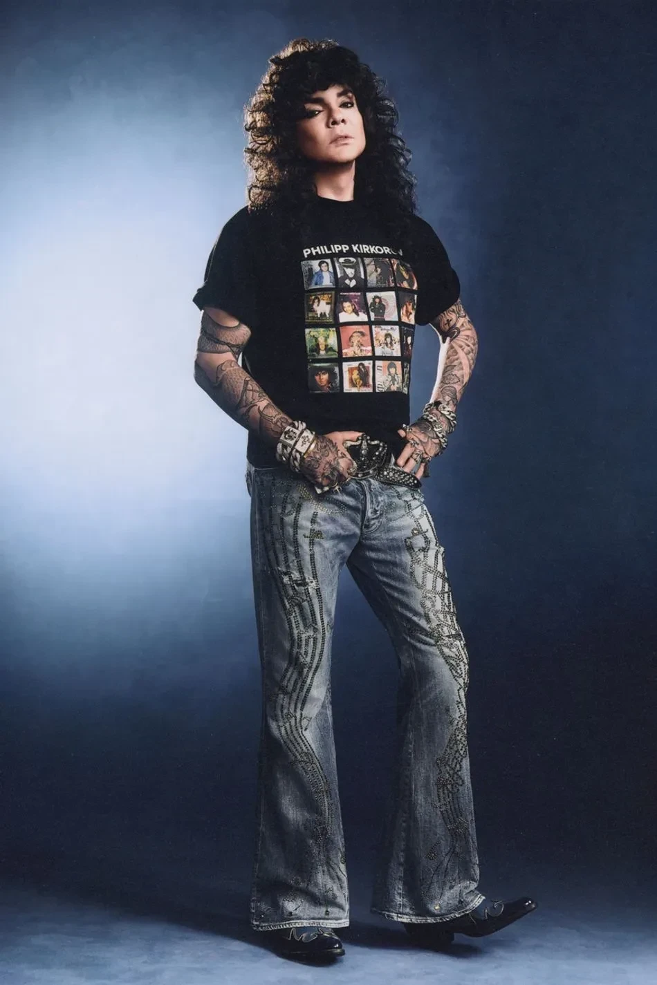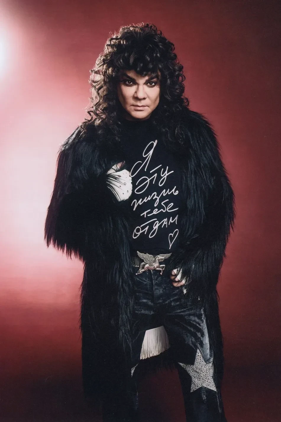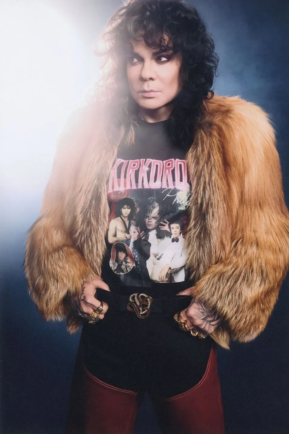 На снимках 58-летний народный артист России позирует в футболках из коллаборации, а также в разных шубах, кожаных брюках, джинсах клёш, ковбойских сапогах и куртке-косухе. Образы Киркорова дополнили массивные ювелирные украшения и причёска в стиле 1980-х годов.