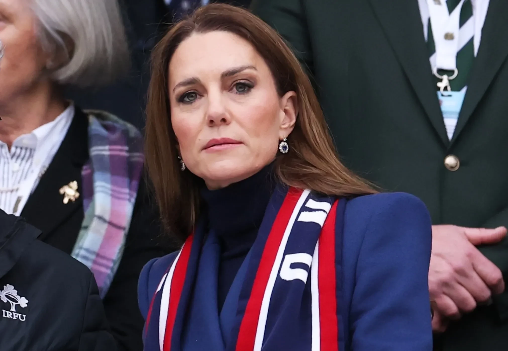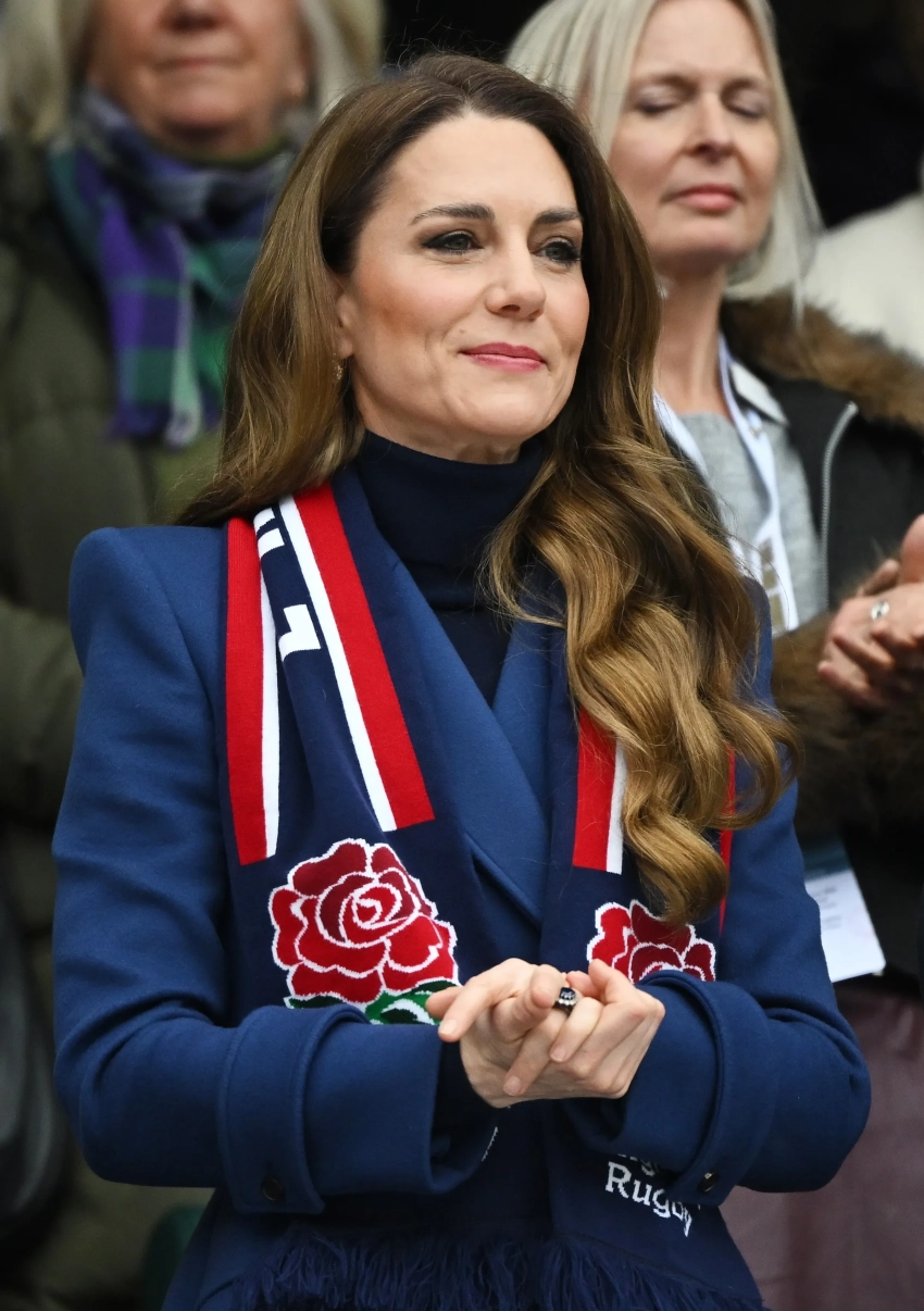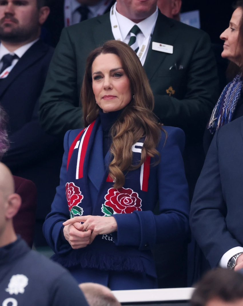 Принцесса Уэльская пришла на игру без мужа, принца Уильяма, и в своём любимом двубортном пальто синего цвета Alexander McQueen, которое она уже надевала не один раз. Кейт Миддлтон дополнила образ кожаными перчатками и шарфом с большими красными розами — логотипом английской команды.