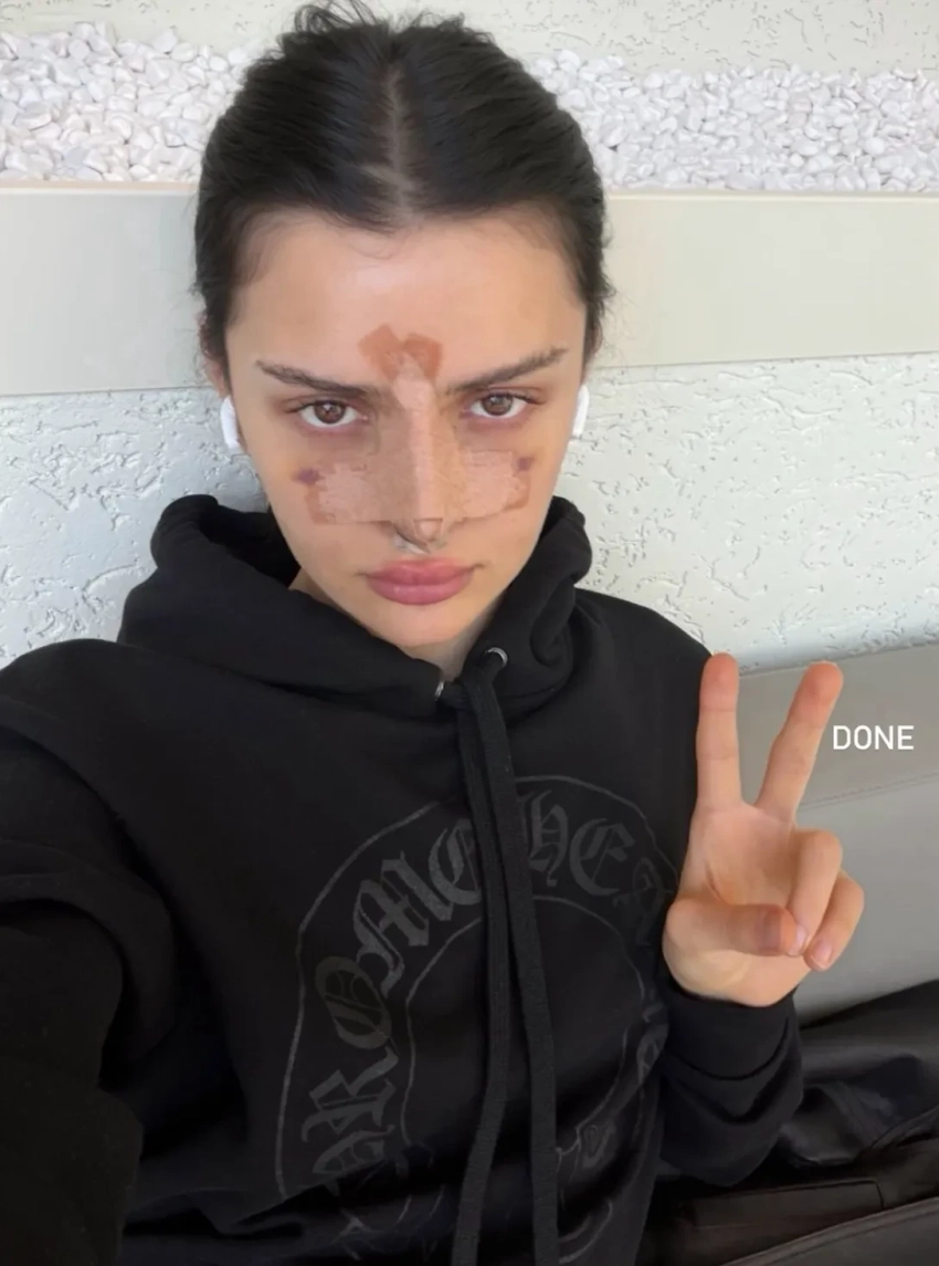 На снимке Саева позирует для селфи с повязкой на носу. Перед операцией она сходила на встречу с хирургом и рассказала, что, по словам врача, её нос дышал только на 10%. Блогерша не уточнила, изменила ли она с помощью операции также форму носа или только устранила дефект.