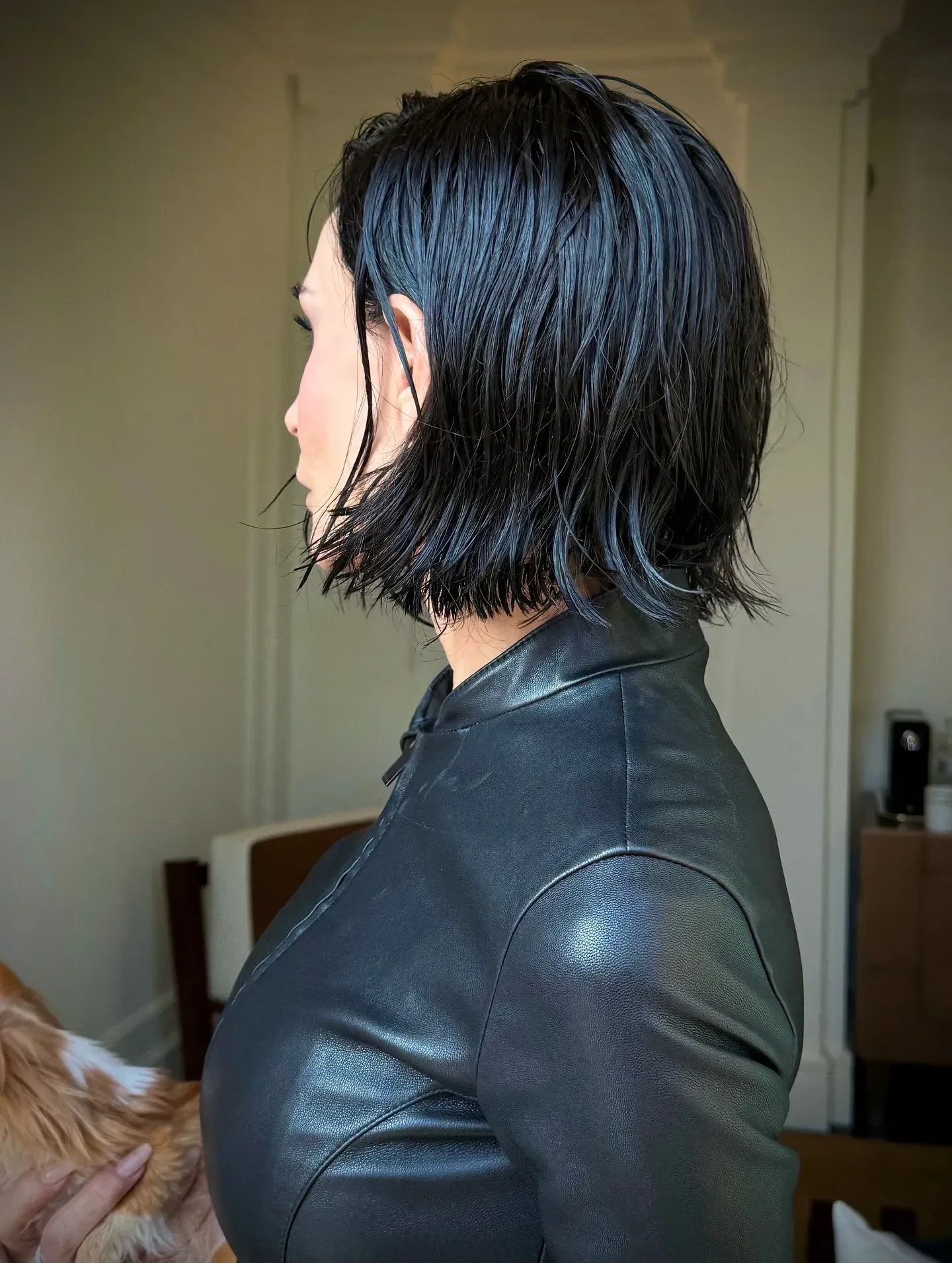 Для выхода в свет похудевшая Мур выбрала total black наряд, напоминающий знаменитый образ Тринити из "Матрицы": она была в кожаной облегающей мотокуртке и расклешённых брюках, которые дополняли остроносые лодочки, сумка и солнцезащитные очки. На руках звезда "Субстанции" держала своего верного спутника, собачку породы чихуахуа по кличке Пилаф.