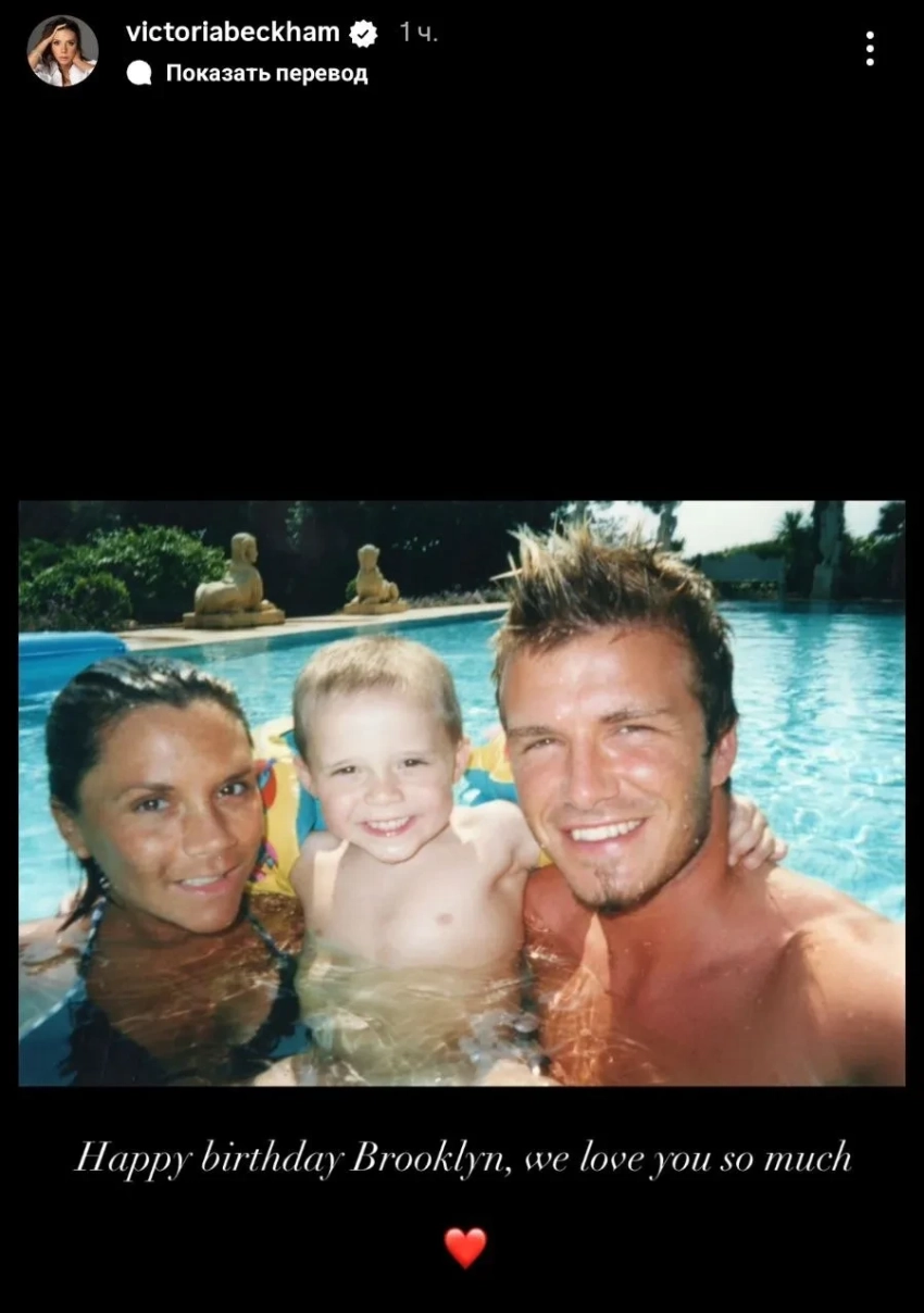 Несколько минут спустя 51-летняя Виктория опубликовала в сторис* такую же фотографию и написала: "С днём рождения, Бруклин, мы тебя очень любим". Она также выложила фотографию, на которой держит на руках маленького сына, сопроводив снимок эмодзи в виде сердец. При этом Бекхэмы не смогли отметить Бруклина на фото, так как ранее он заблокировал их в соцсетях.