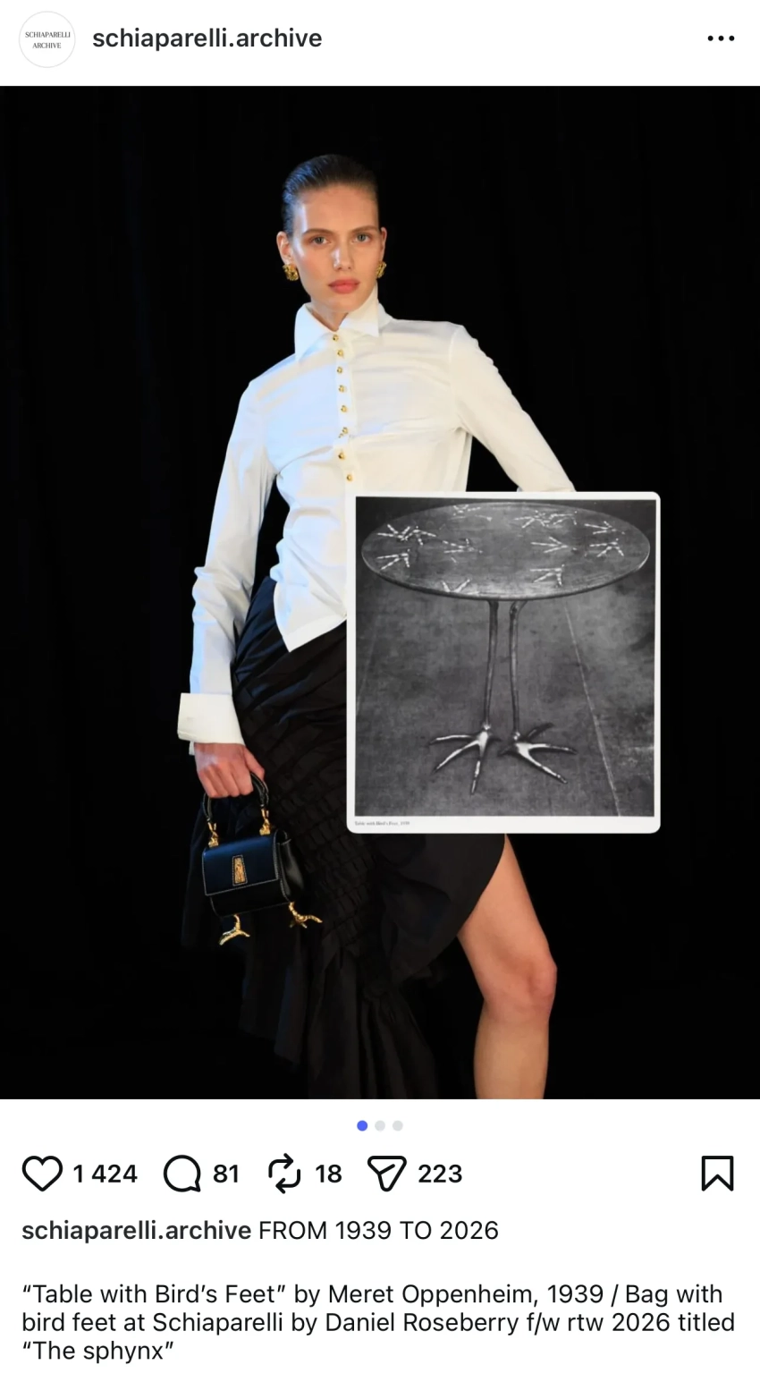 По информации из аккаунта schiaparelli.archive в инстаграме*, сумки из новой коллекции отсылают к столику Traccia, который впервые был представлен в 1939 году в парижской галерее Galerie René Drouin. Данная работа отражала общее увлечение Мерет Оппенгейм и Эльзы Скиапарелли дикой природой и птицами.