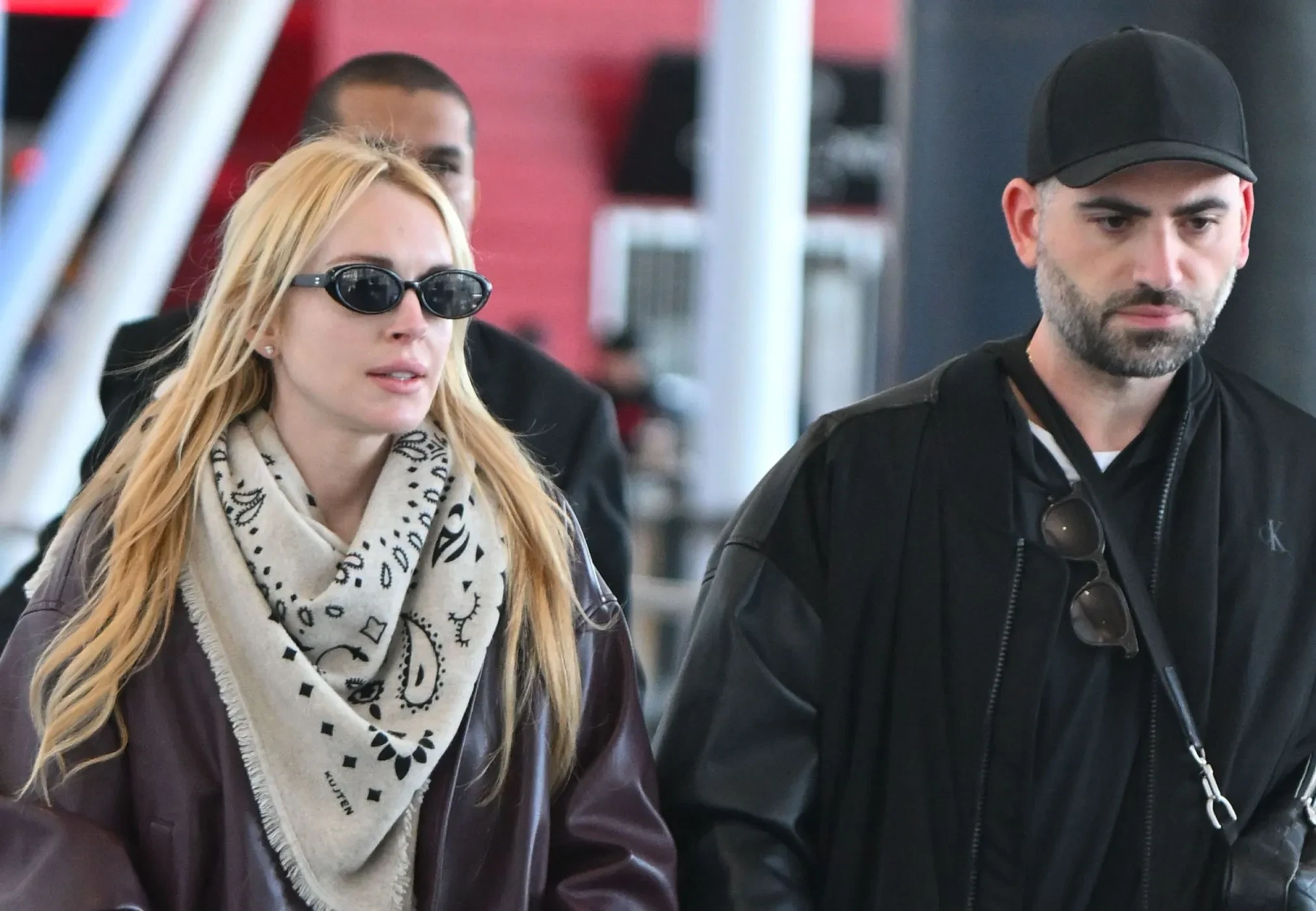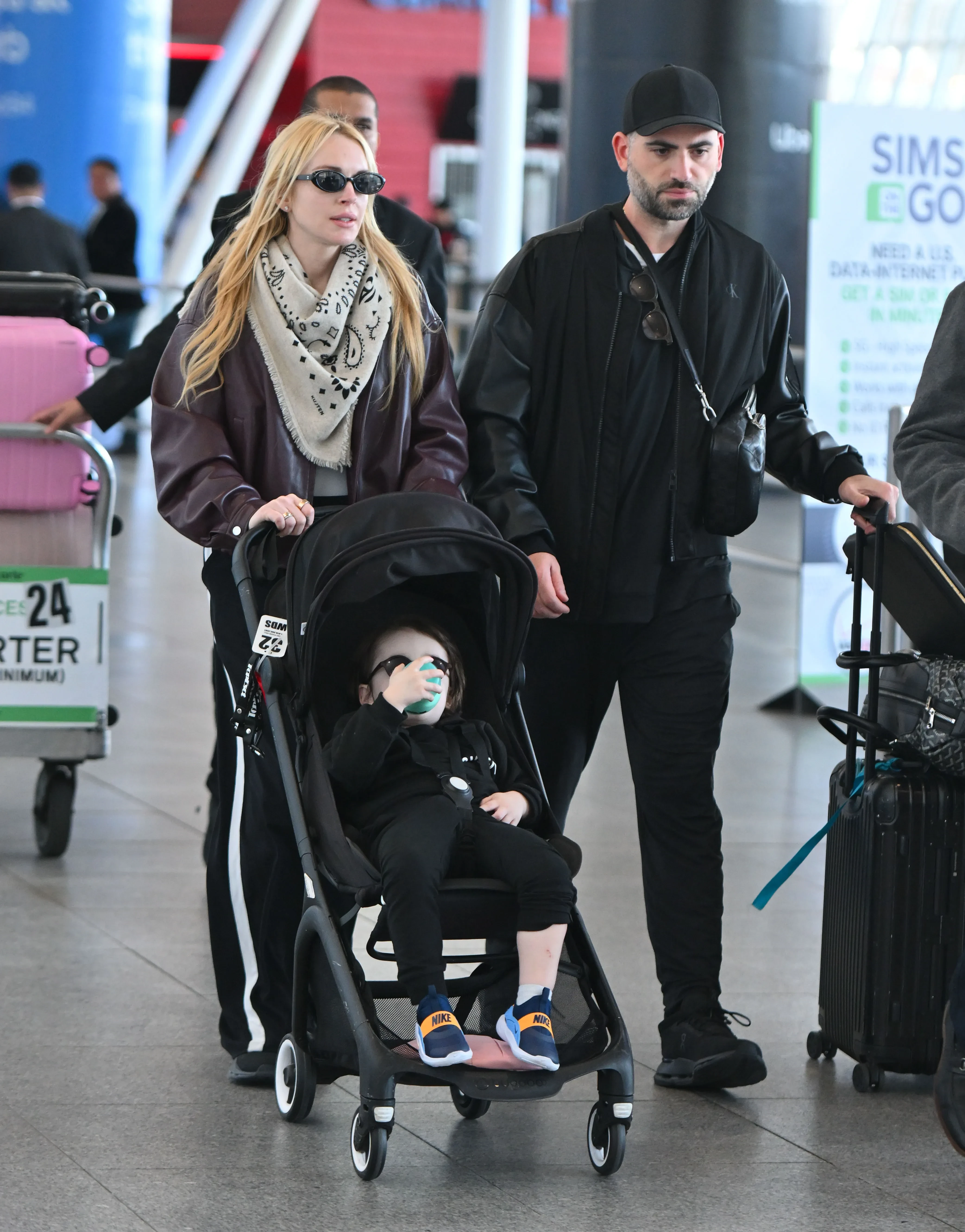 Линдси Лохан с мужем и сыном в аэропорту Нью-ЙоркаЛиндси Лохан с улыбкой сквозь солнцезащитные очки позировала фотографам в переполненном аэропорту Нью-Йорка. Для перелёта она выбрала комфортный образ: свободные чёрные спортивные штаны, простую белую футболку и бордовую кожаную куртку. Шею актрисы украшал пестрый шарф, а длинные светлые волосы были распущены. В таком же casual-стиле и образе total black её сопровождал супруг.