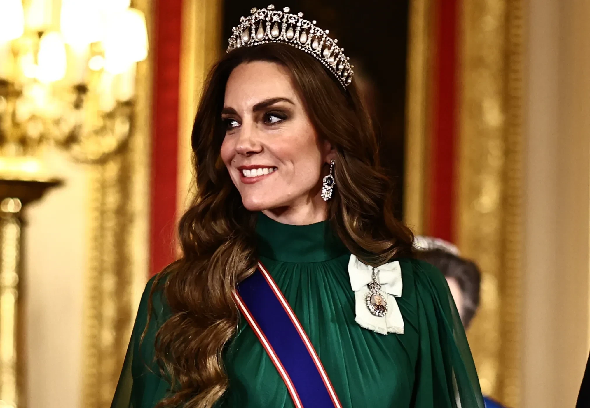Кейт Миддлтон и принц УильямКейт МиддлтонТем временем королева Камилла надела белое платье с вышивкой от Фионы Клэр. Она дополнила наряд бельгийской сапфировой тиарой, в которой уже была на банкетах в честь визитов президентов Франции и США, а также бриллиантовым колье в форме змеи.