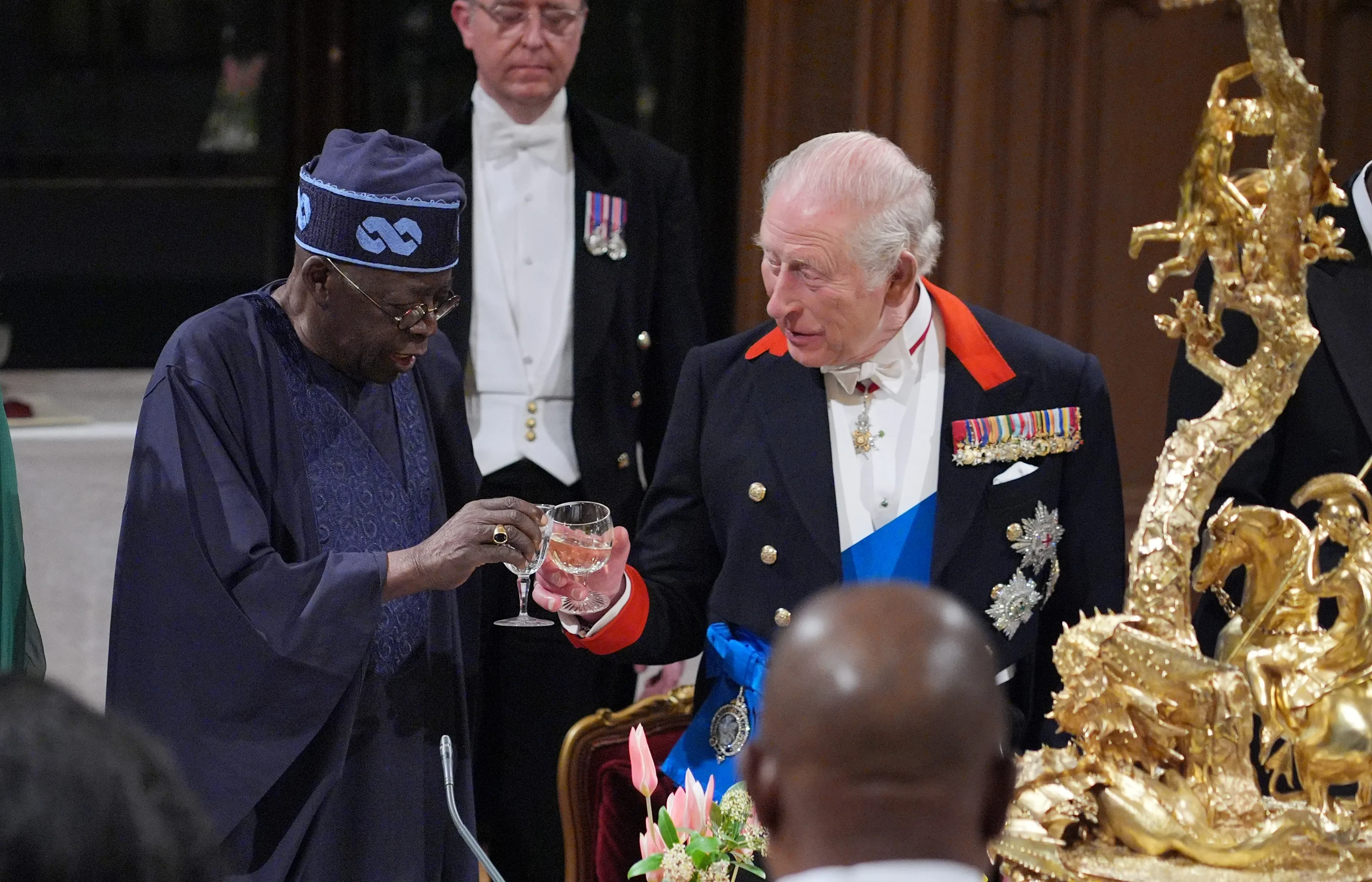 Королева Камилла и король Карл III, Бола и Олуреми ТинубуГосударственный банкет в Виндзорском замкеКоролева Камилла и король Карл III, Бола ТинубуГосударственный банкет в Виндзорском замкеГосударственный банкет в Виндзорском замкеБола Тинубу и король Карл IIIСтоит отметить, что именно герцог и герцогиня Уэльские стали первыми членами королевской семьи, встретившими Тинубу и его супругу по прибытии в Великобританию. Супруги сопроводили пару в Виндзор, где их уже ждали Карл III и Камилла. Затем гостям провели экскурсию по замку, уделив особое внимание экспонатам Королевской коллекции, связанным с Нигерией.