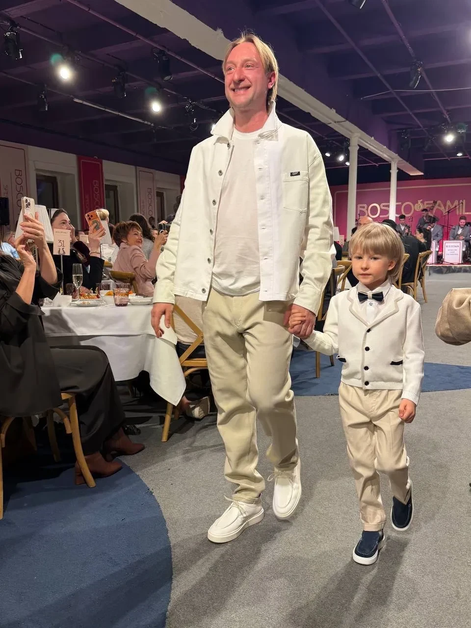 Модное шоу "Стильные ребята" открывали Евгений Плющенко и Яна Рудковская с детьми. Продюсер прошлась по импровизированному подиуму в белом романтичном платье с кружевными вставками, а её супруг (сделавший недавно подтяжку лица) и сыновья — пятилетний Арсений и 13-летний Александр — представили похожие образы в светлых тонах.