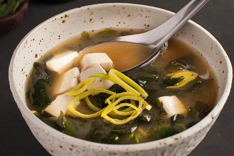 Завтрак: Мисо-суп с тофу и зеленью, чашка коричневого риса, зеленый чай.