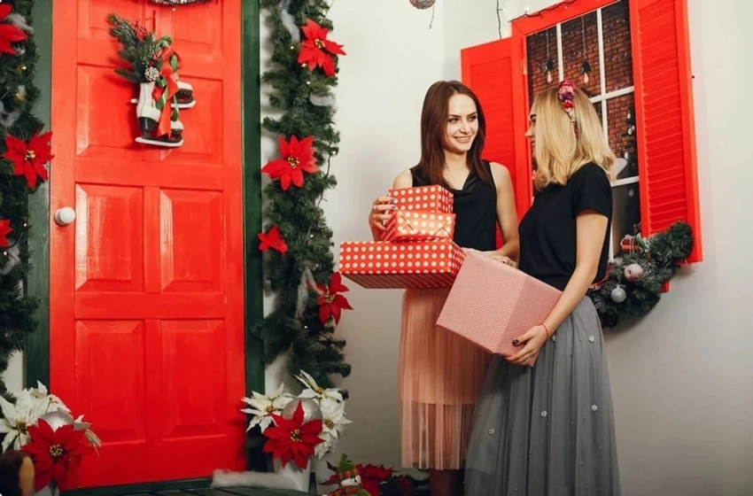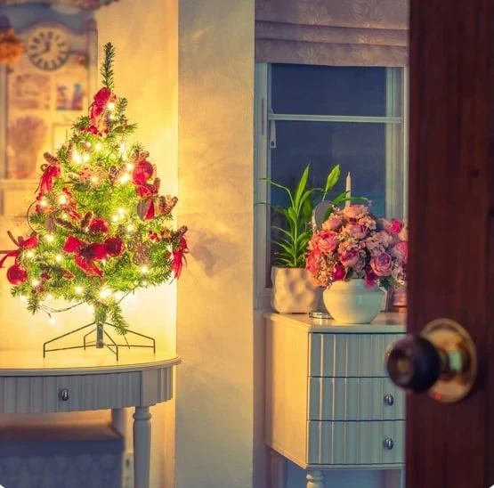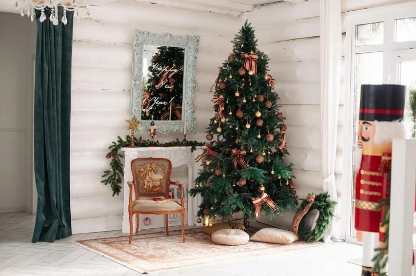 Первое, что видят гости — это вход. Повесь рождественский венок с шишками и красными лентами, укрась зеркало снежинками или подсветкой из гирлянды.