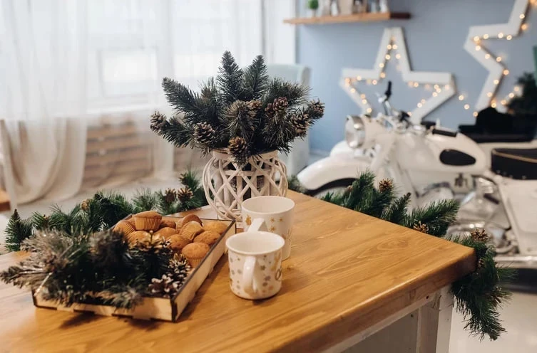 На кухне особенно уютно пахнет праздником. Укрась стол веточками ели, засушенными апельсинами и палочками корицы. Повесь праздничную гирлянду на окно, постели скатерть красного или белого цвета, укрась стулья лентами.