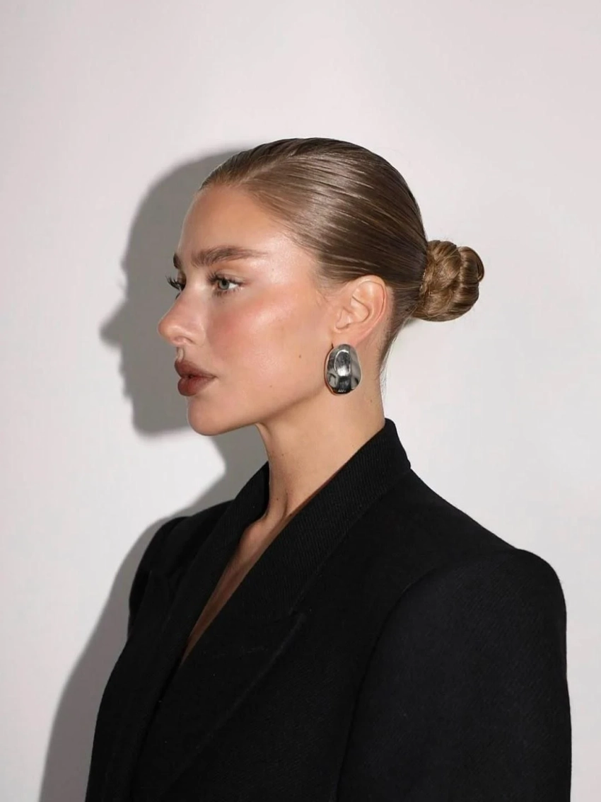 Лучше собирать пучок у основания шеи, без чрезмерного натяжения. Легкая плотность внизу головы создает собранность, но не жесткость. Гладкие волосы дают более графичный эффект, текстурные — мягкий, однако акцент на скулах сохраняется за счет свободной линии от ушей вверх.