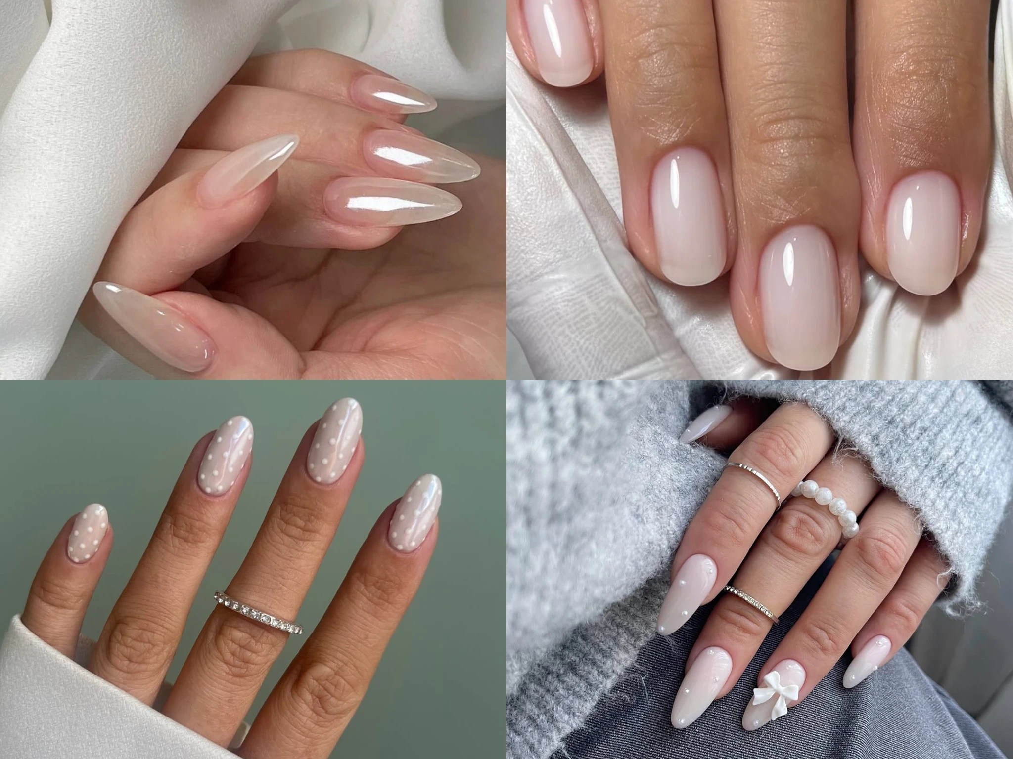 Носим молочный как в чистом моно-варианте, так и в сложных комбинациях: добавляем белый горошек, украшаем ногти стразами, экспериментируем с жемчужной втиркой или комбинируем его с модными принтами.